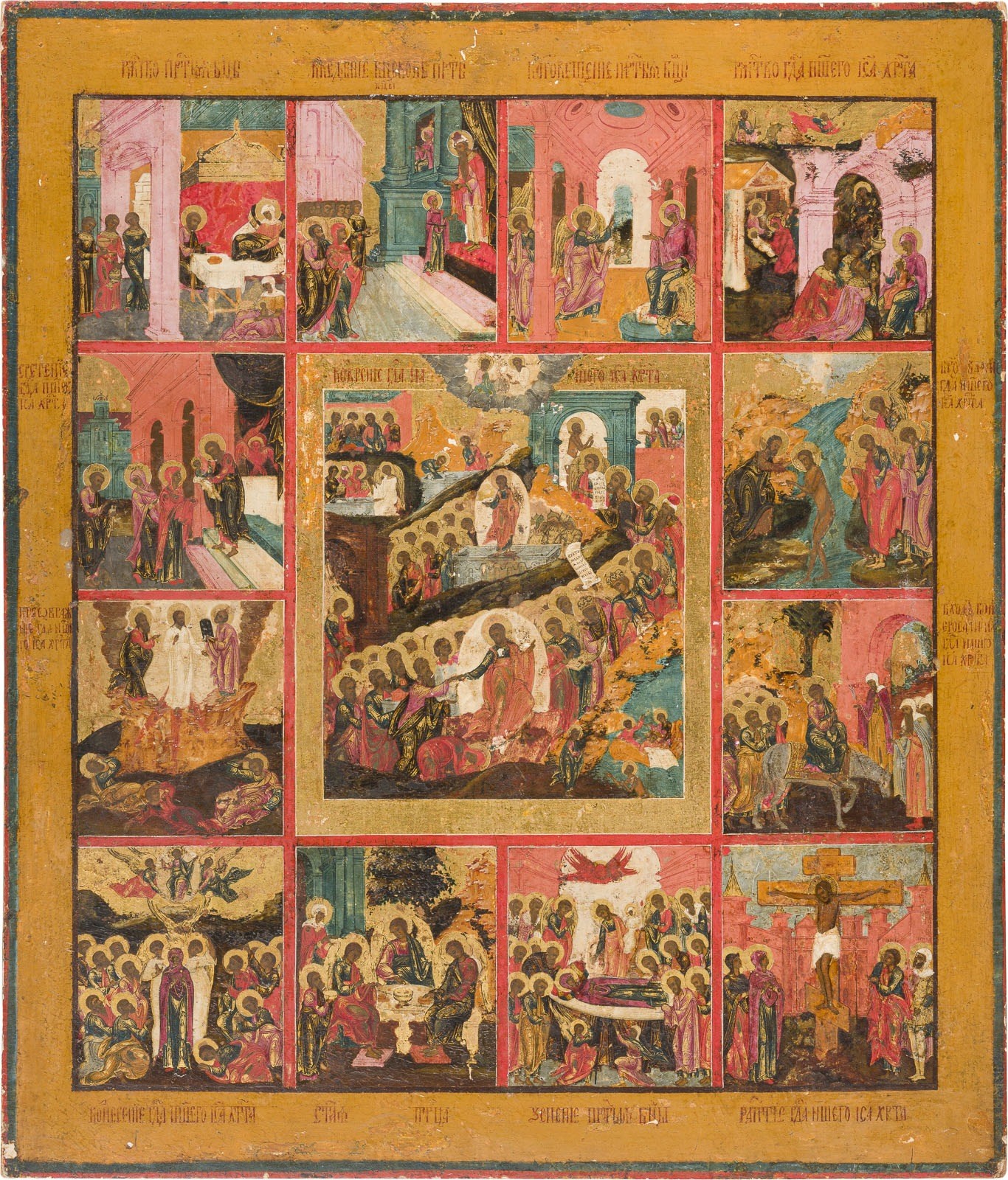 GROSSFORMATIGE IKONE MIT DER HÖLLENFAHRT UND AUFERSTEHUNG MIT ZWÖLF HOCHFESTEN