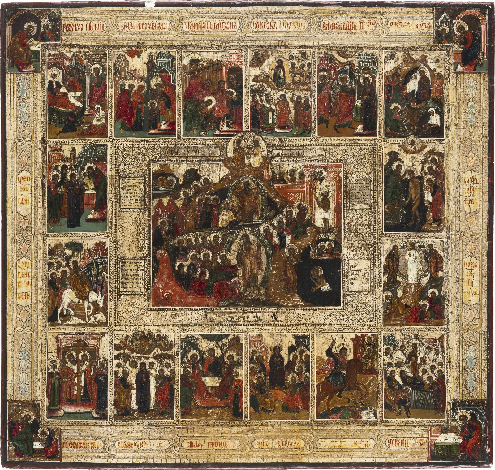 GROSSFORMATIGE IKONE MIT DER HÖLLENFAHRT UND AUFERTEHUNG, 16 HOCHFESTEN UND DEN VIER EVANGELISTEN