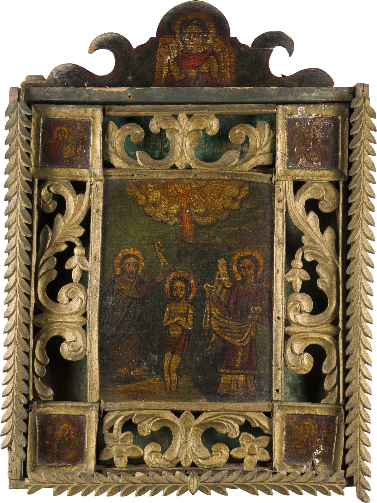 GROSSFORMATIGE IKONE MIT DER TAUFE CHRISTI UND DEN VIER EVANGELISTEN