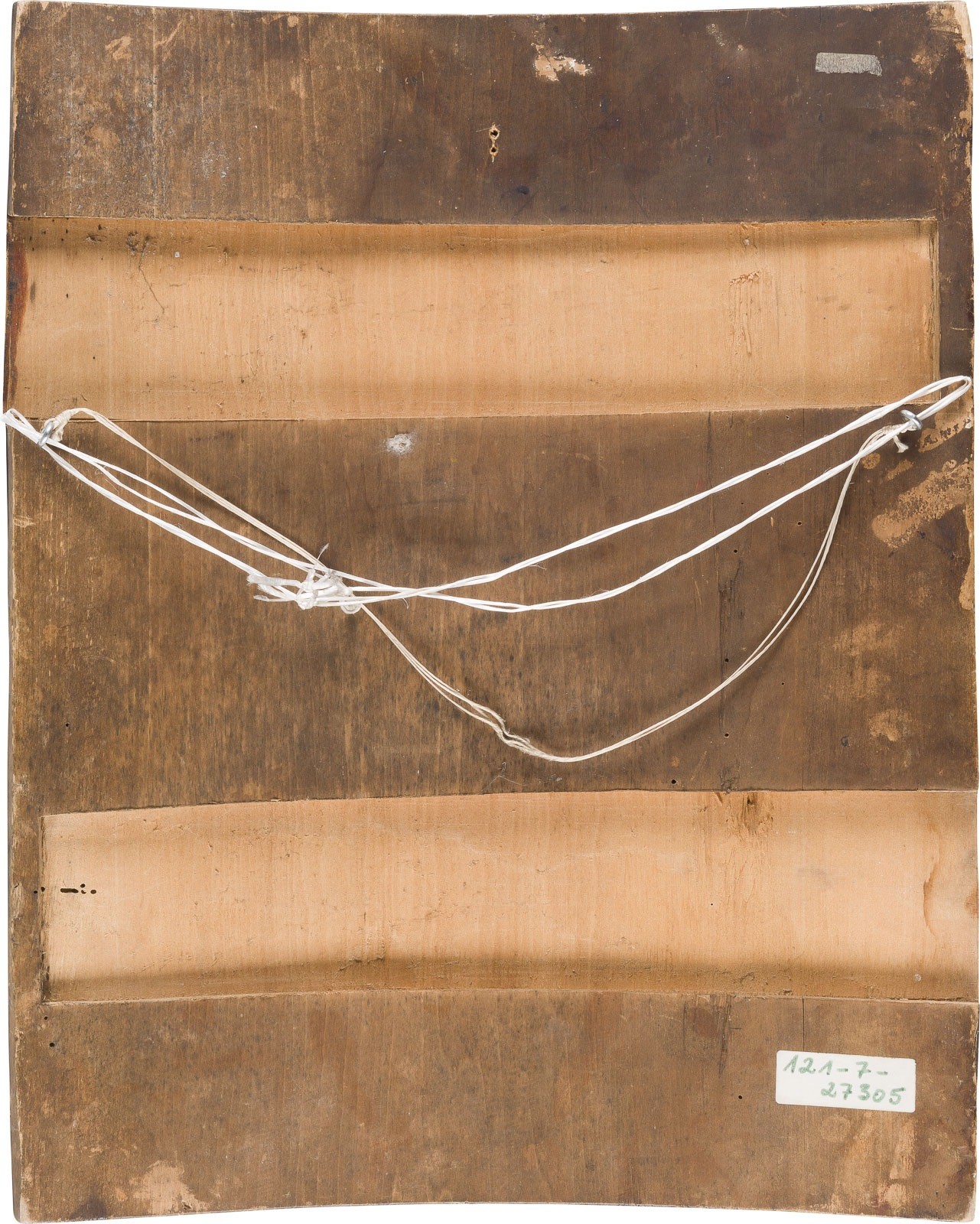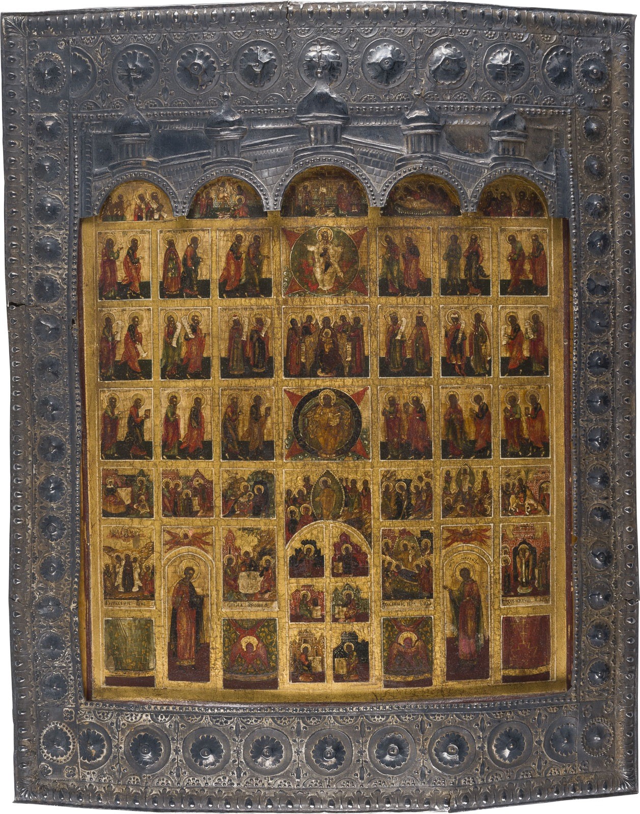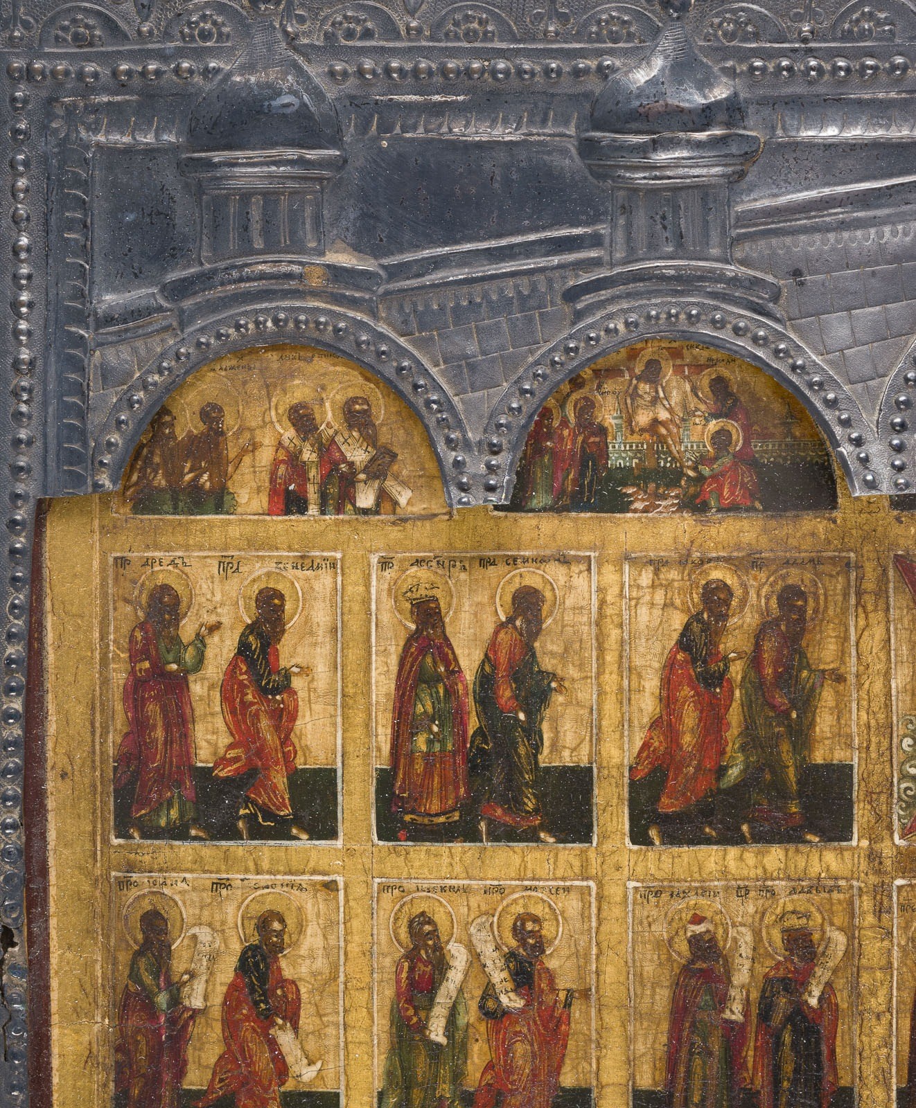 Einzeltafel mit zwei Rückseiten-Sponki (verloren). Kowtscheg, Eitempera auf Kreidegrund, Goldgrund. Basma aus Silber mit getriebenem Dekor. 44,5 x 36,3 cm. Punziert mit Stadtmarke, Beschaumeisterzeichen, Feingehalt '84' und Meistermarke 'IFW' in Kyrillisch. Partiell rest., Basmarand teils besch.