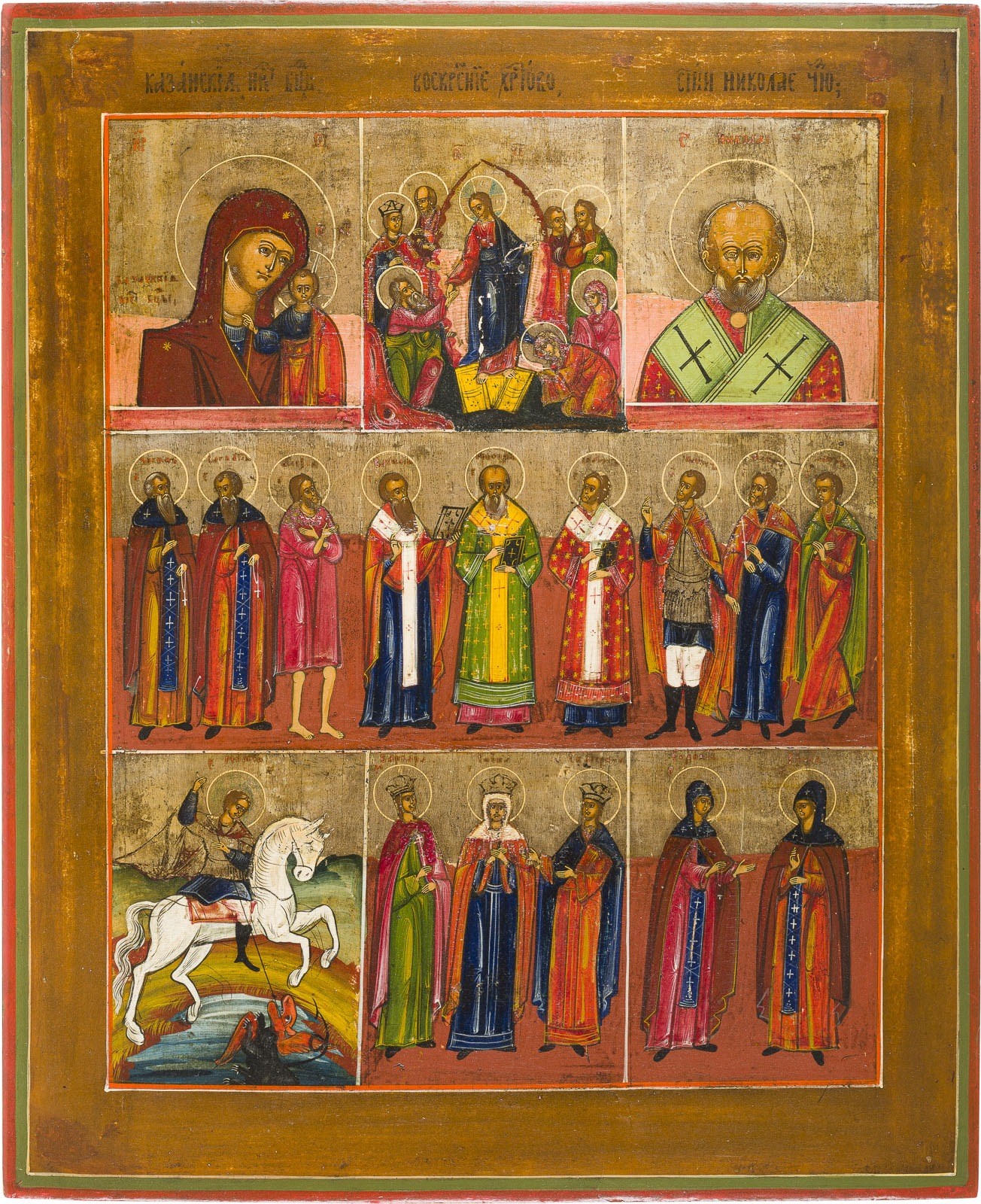 GROSSFORMATIGE MEHRFELDER-IKONE MIT DER HADESFAHRT CHRISTI, DER GOTTESMUTTER VON KASAN UND HEILIGEN