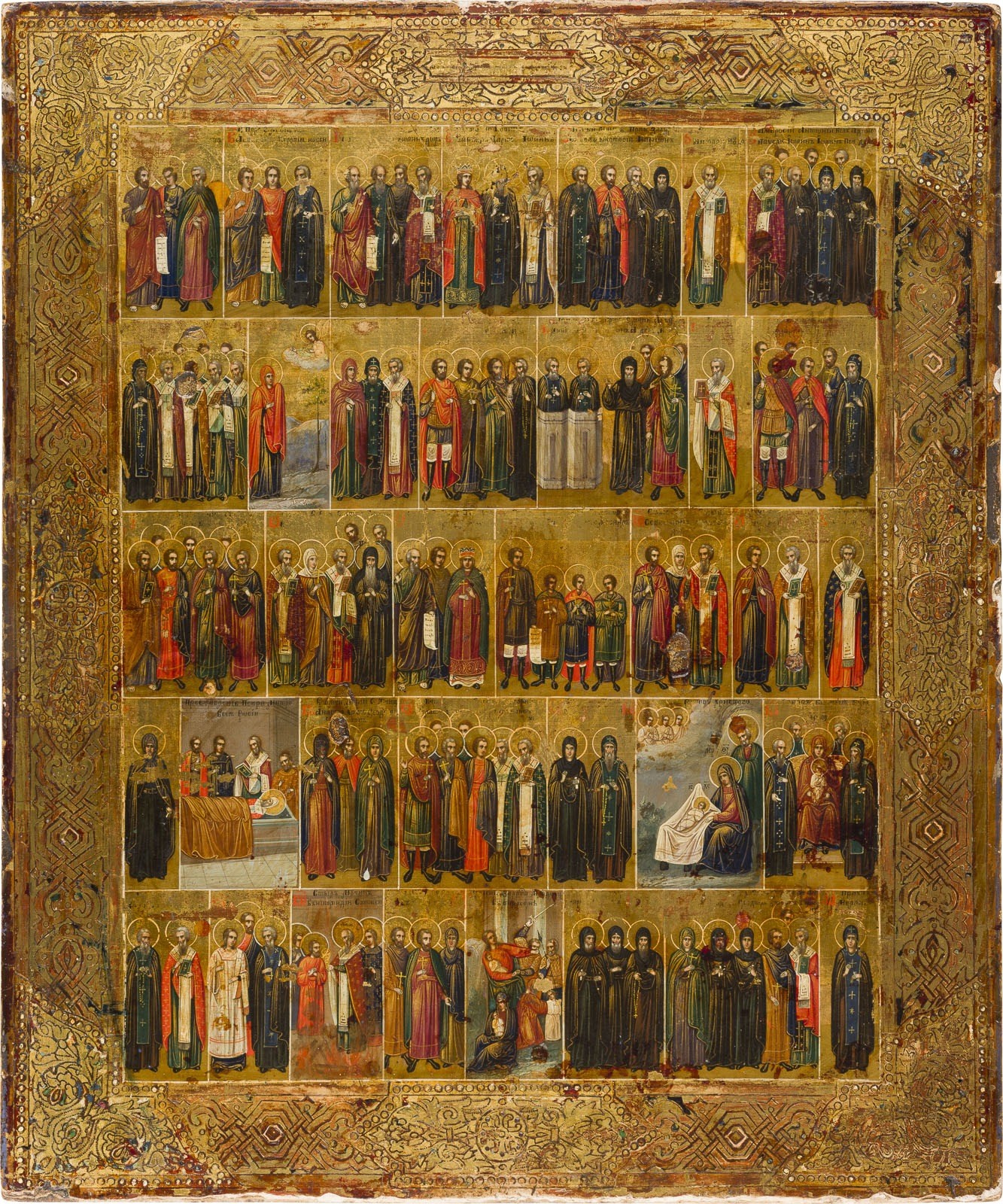 Verbund zweier Laubholz-Bretter mit zwei Rückseiten-Sponki. Eitempera auf Kreidegrund, Goldgrund, ornamental gravierter Rand. 53 x 43,8 cm. Bereibungen, kleinere Substanzverluste.