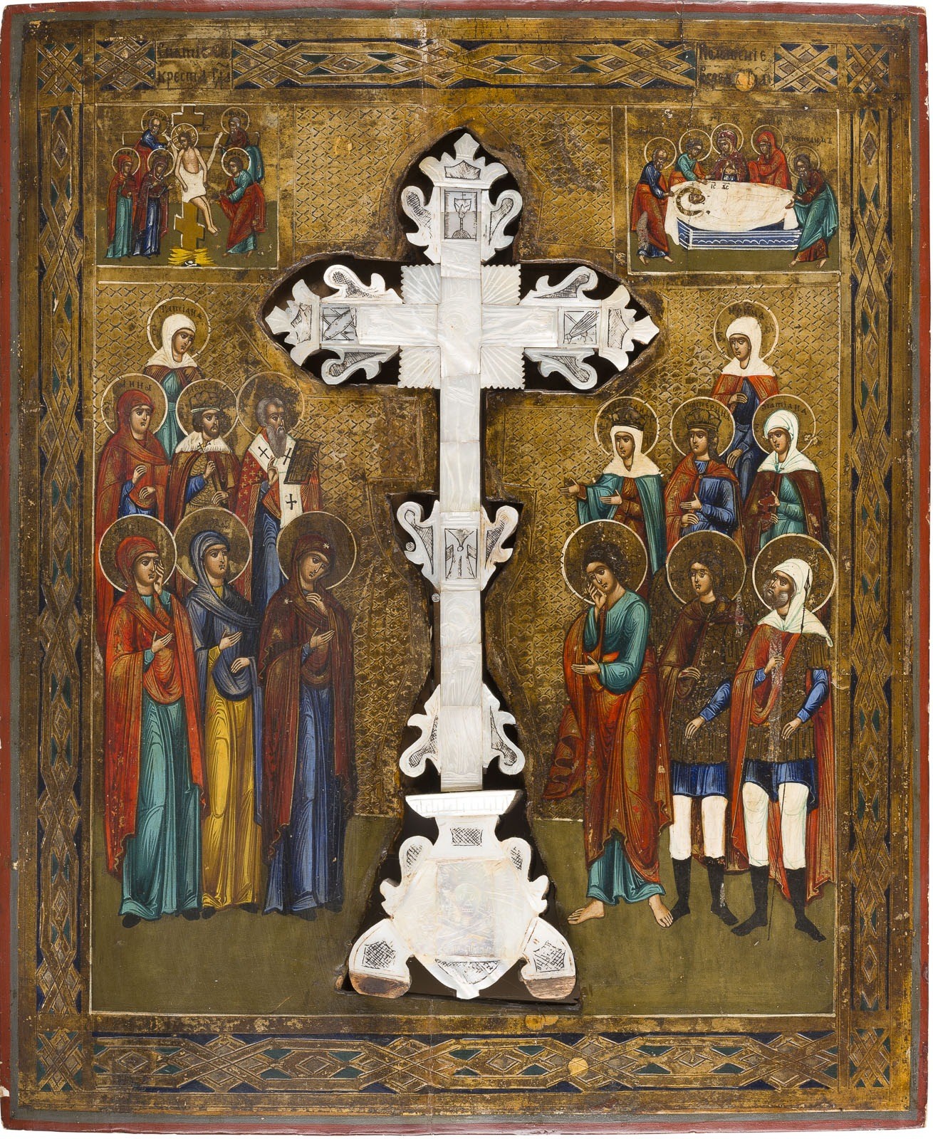 Verbund mehrerer Bretter mit zwei Rückseiten-Sponki. Eitempera auf Kreidegrund, versilberter Hintergrund goldfarben lasiert und ornamental punziert. Eingesetztes Perlmutt-Kreuz. 53 x 44 cm. Mittig eingearbeitetes, mit Perlmutt belegtes Standkreuz mit dem gekreuzigten Christus. Zu