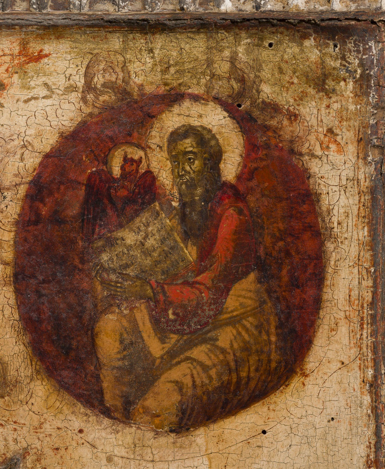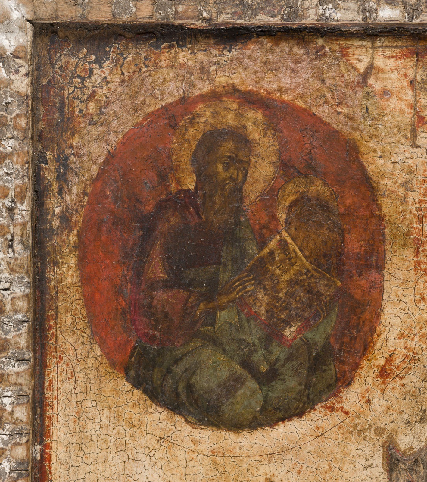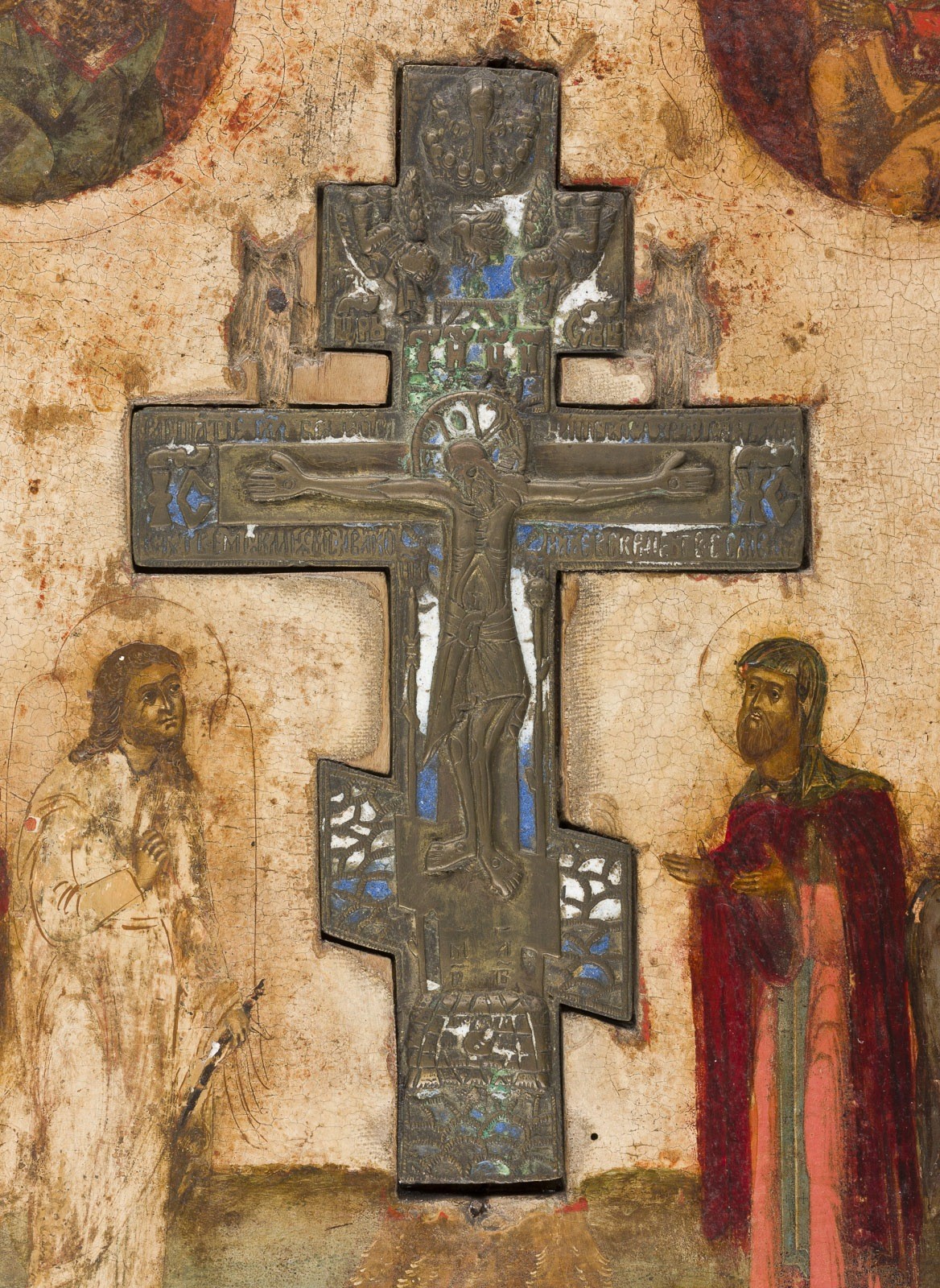 Holztafel mit ornamental geschnitzten Kantensteg. Eitempera auf Kreidegrund. Bronze, gegossen und mehrfarbig emailliert. 44 x 35,2 cm. Farbe des Hintergrundes abgenommen, partiell rest., Fehlstellen.