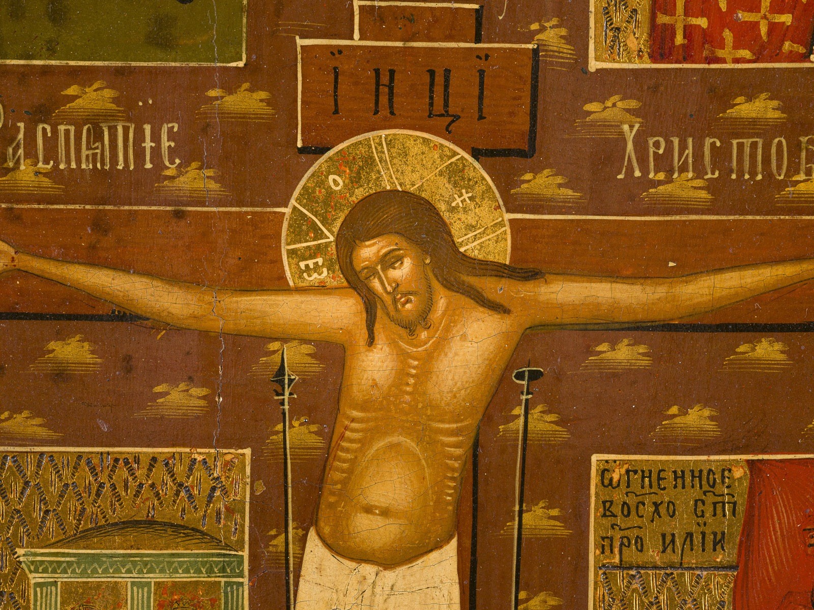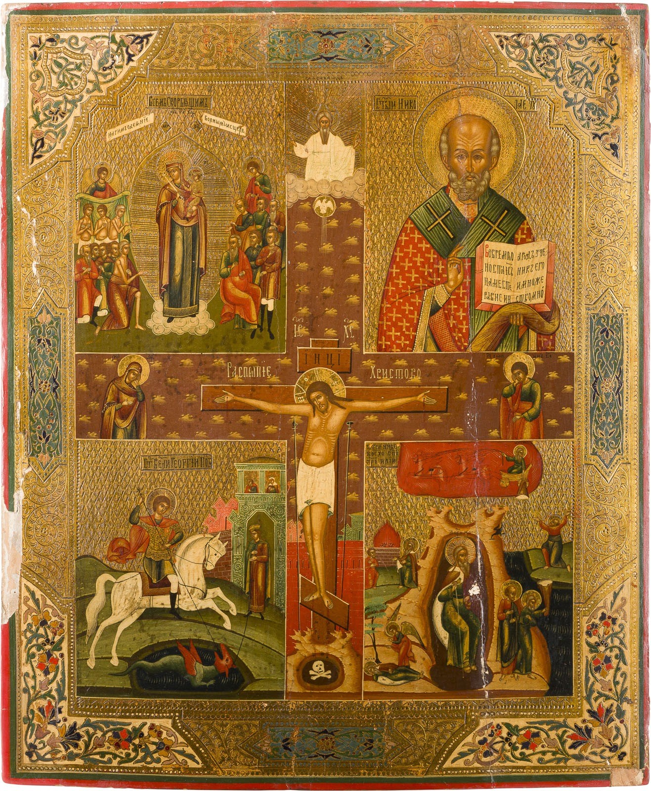 GROSSFORMATIGE VIERFELDER-IKONE MIT DER KREUZIGUNG, DER GOTTESMUTTER 'FREUDE ALLER LEIDENDEN' UND HEILIGEN