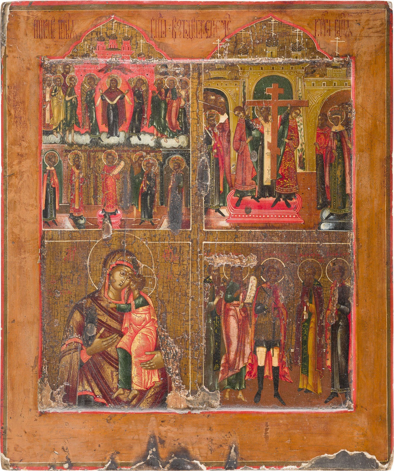 GROSSFORMATIGE VIERFELDER-IKONE MIT GNADENBILDERN DER GOTTESMUTTER, DER ERHÖHUNG DES WAHREN KREUZES UND HEILIGEN