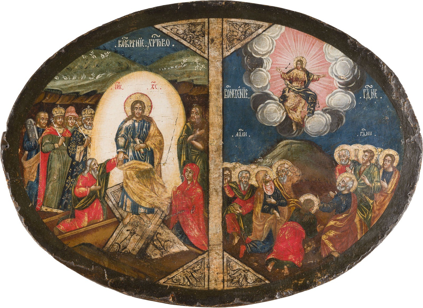 GROSSFORMATIGE ZWEIFELDER-IKONE MIT DER HADESFAHRT CHRISTI UND SEINER HIMMELFAHRT AUS EINER KIRCHEN-IKONOSTASE