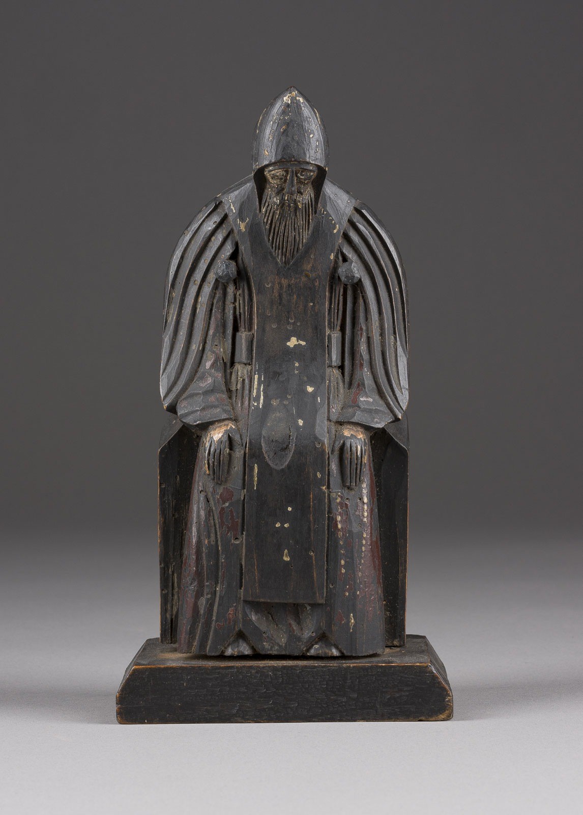 Holz, vollplastisch geschnitzt, farbig gefasst. H. 22,5 cm. Min. Fassungsverluste, verso alter Anobienbefall.
