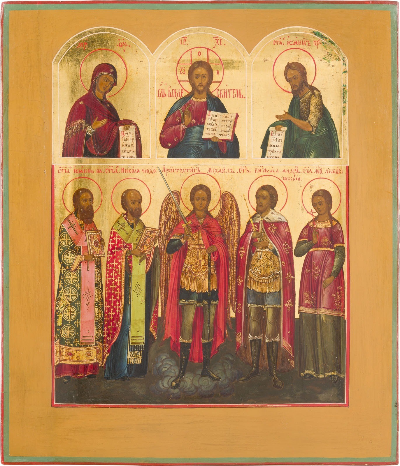 IKONE MIT DEESIS, DEM ERZENGEL MICHAEL UND VIER AUSGEWÄHLTEN HEILIGEN