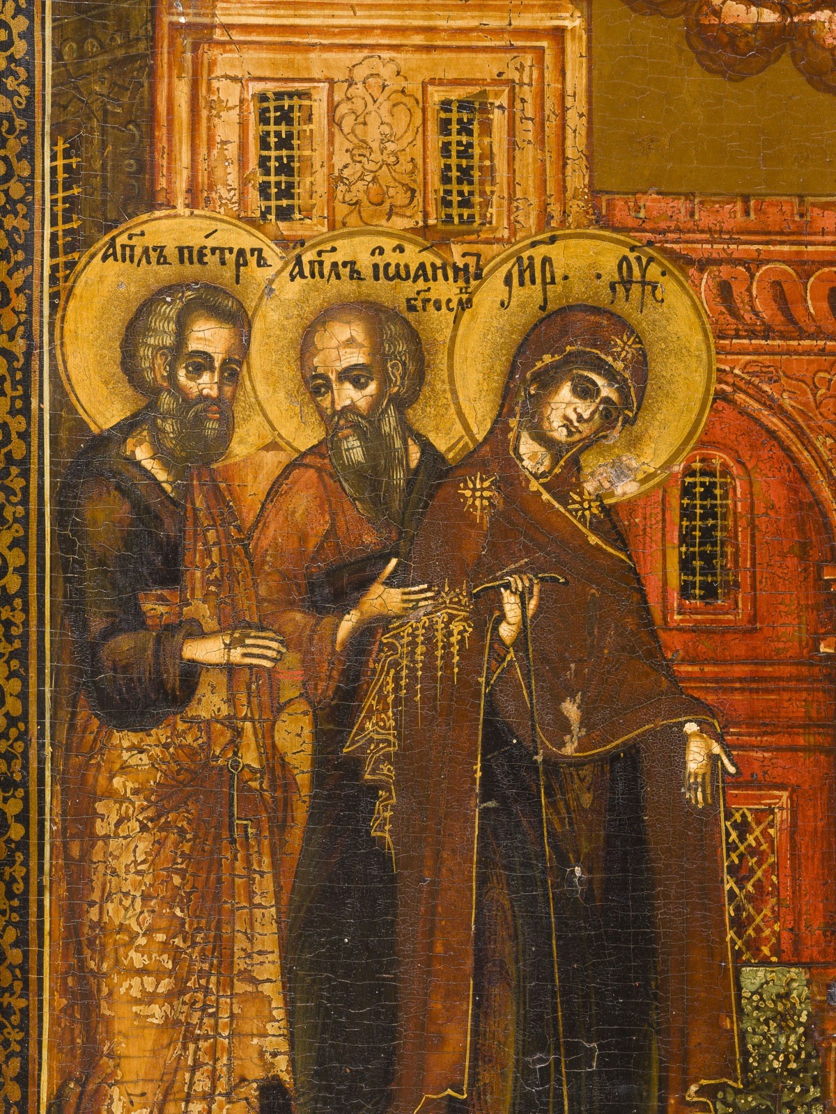 Einzeltafel mit zwei Rückseiten-Sponki. Kowtscheg, Eitempera auf Kreidegrund, Nimben vergoldet. 32,3 x 27,5 cm. Kleinere Substanzverluste, Rand min. besch.