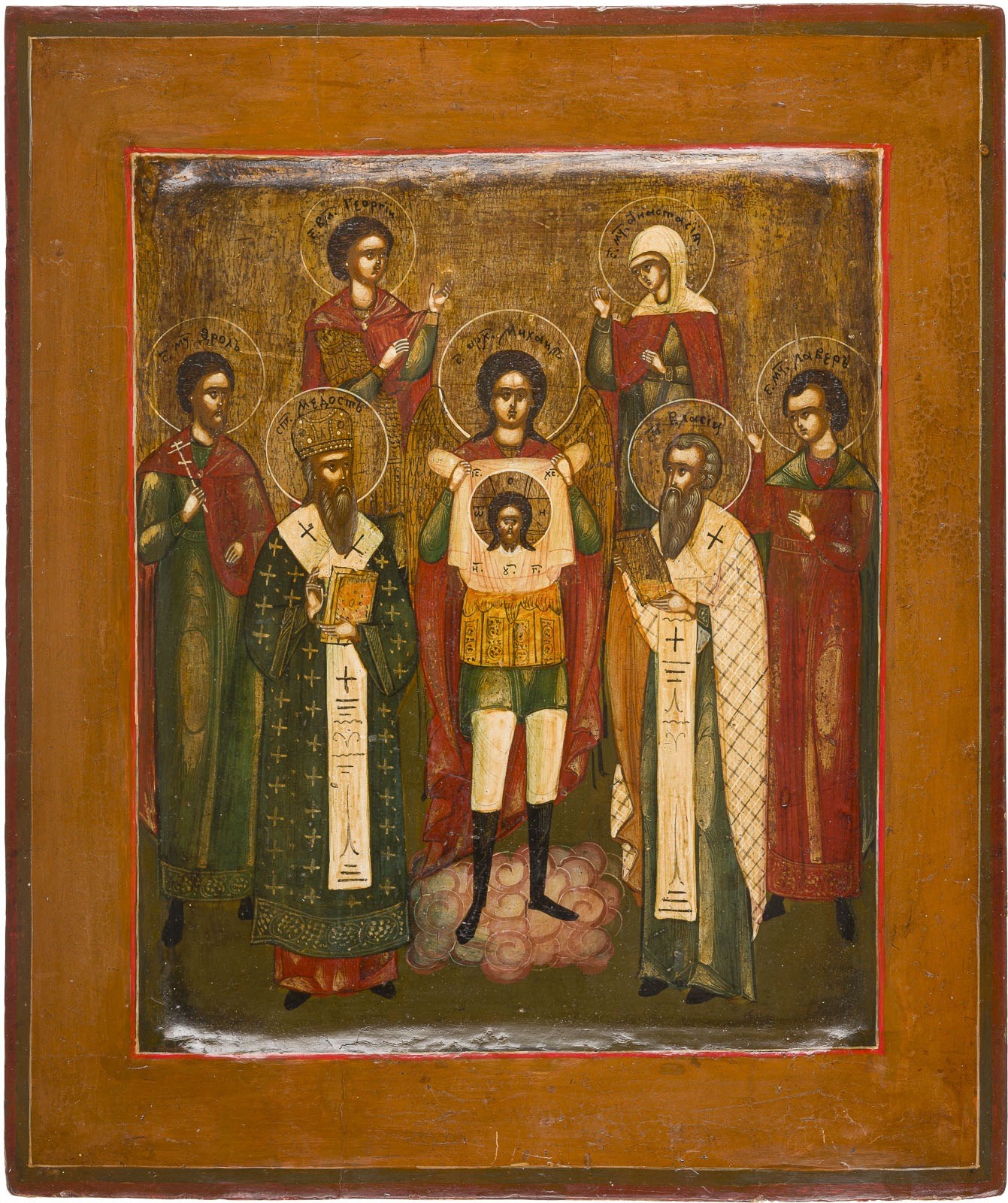 IKONE MIT DEM ERZENGEL MICHAEL FLANKIERT VON SECHS HEILIGEN, DARUNTER FLORUS UND LAURUS