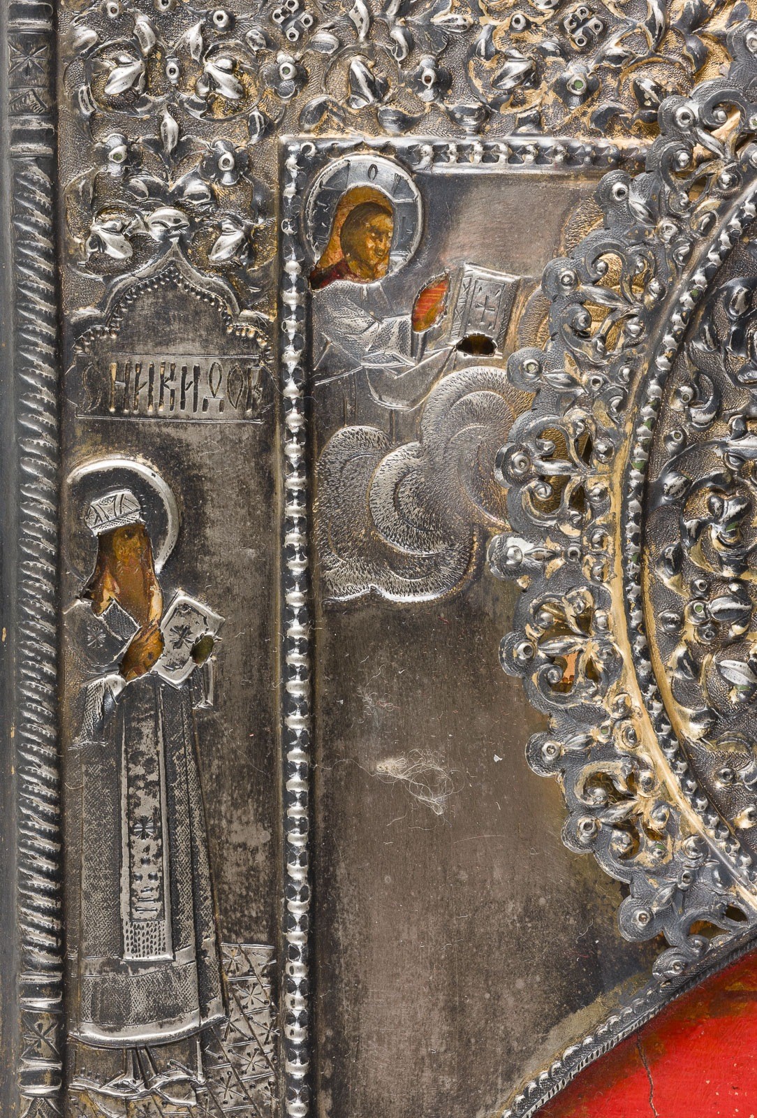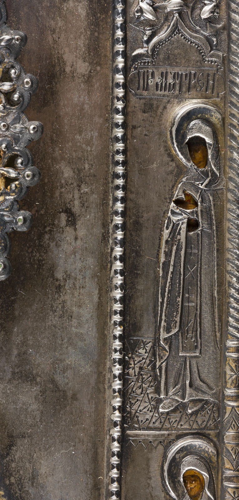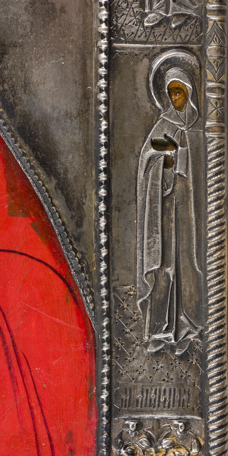 Holztafel mit zwei Rückseiten-Sponki, verso Samtabdeckung. Eitempera auf Kreidegrund, Nimbus vergoldet. Riza aus getriebenem Silber, vergoldet. 31,2 x 26,4 cm. Punziert mit Stadtmarke, Beschaumeisterzeichen, Feingehalt '84' und Meistermarke. Vier Randheilie, darunter die heilige Marina. Min. Retuschen.