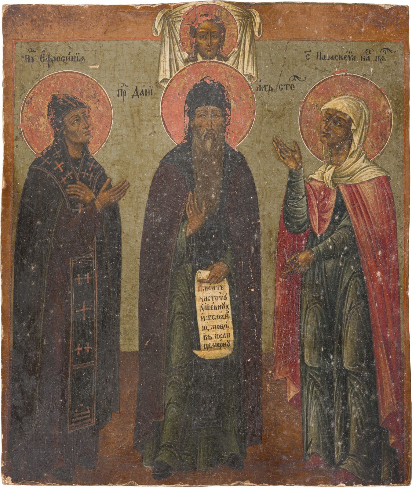 IKONE MIT DEM HEILIGEN DANIEL VON MOSKAU FLANKIERT VON DEN HEILIGEN EUFROSINIA UND PARASKEWA