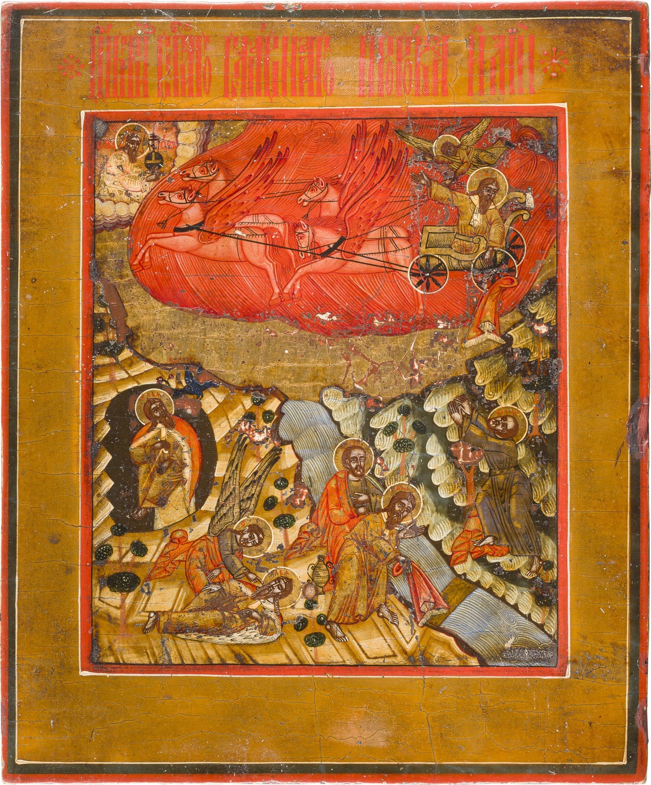 IKONE MIT DEM PROPHETEN ELIAS, SEINEM LEBEN IN DER WÜSTE UND SEINER FEURIGEN HIMMELFAHRT