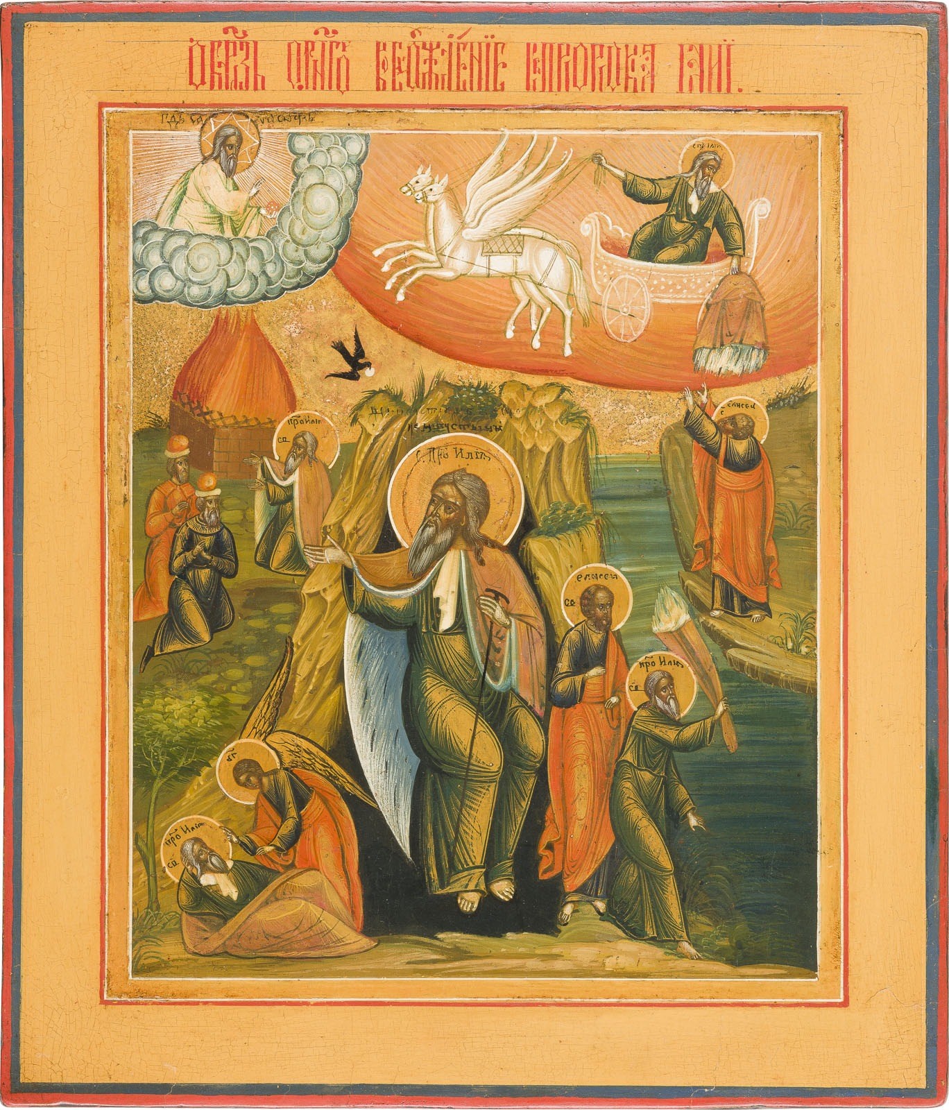 IKONE MIT DEM PROPHETEN ELIAS, SEINEM LEBEN IN DER WÜSTE UND SEINER FEURIGEN HIMMELFAHRT