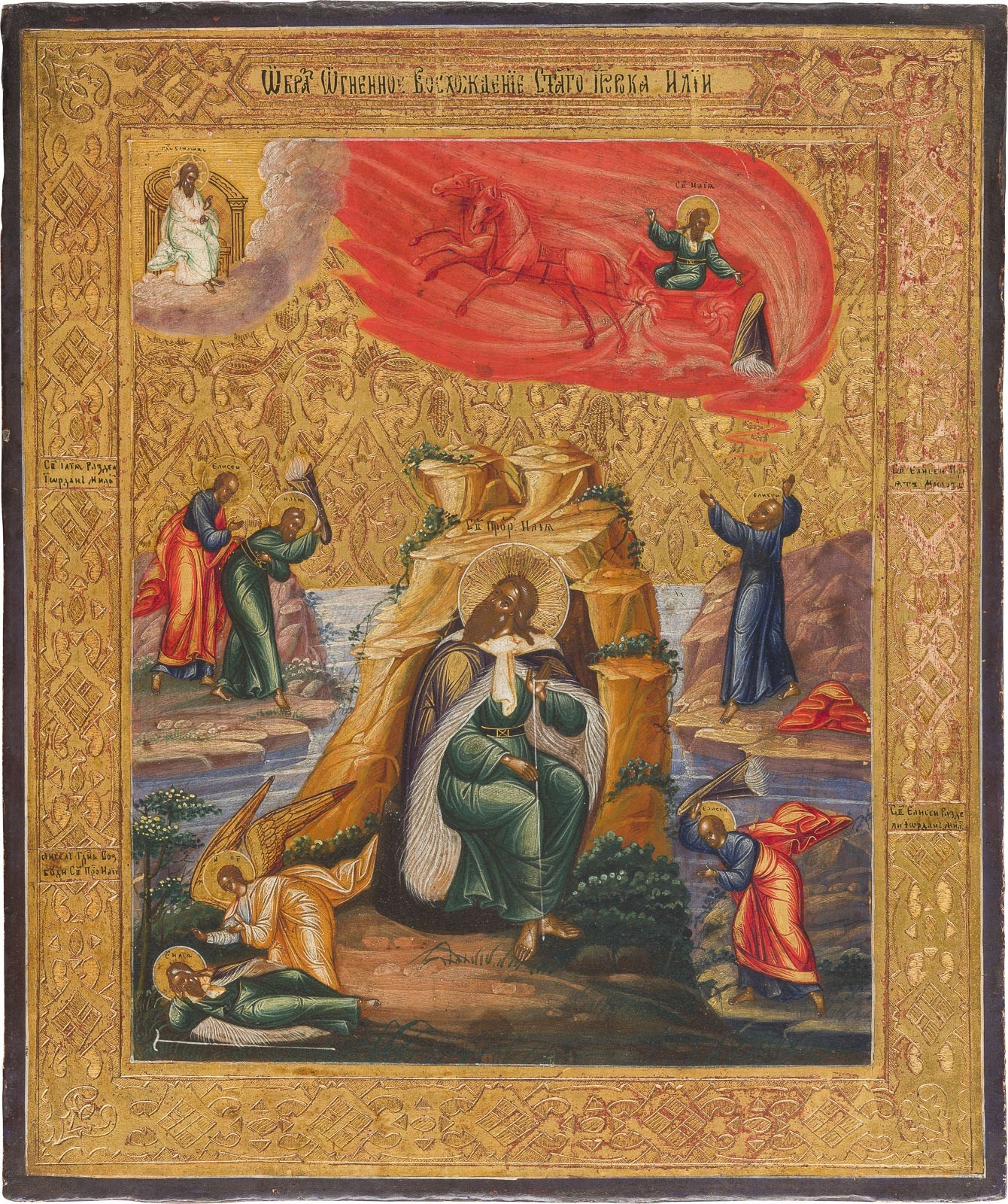 IKONE MIT DEM PROPHETEN ELIAS, SEINEM LEBEN IN DER WÜSTE UND SEINER FEURIGEN HIMMELFAHRT