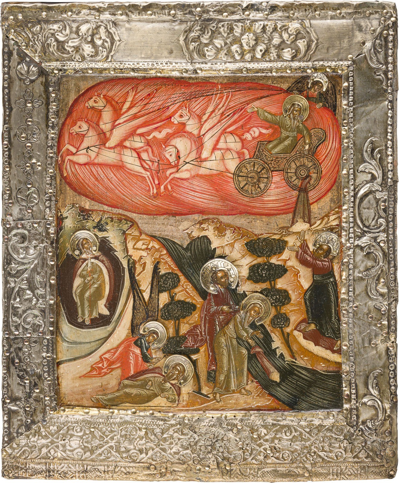 IKONE MIT DEM PROPHETEN ELIAS, SEINEM LEBEN IN DER WÜSTE UND SEINER FEURIGEN HIMMELFAHRT MIT SILBER-BASMA
