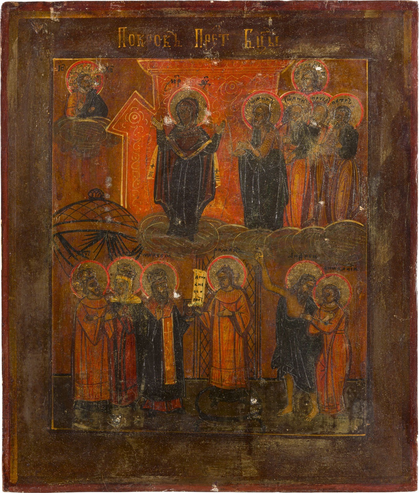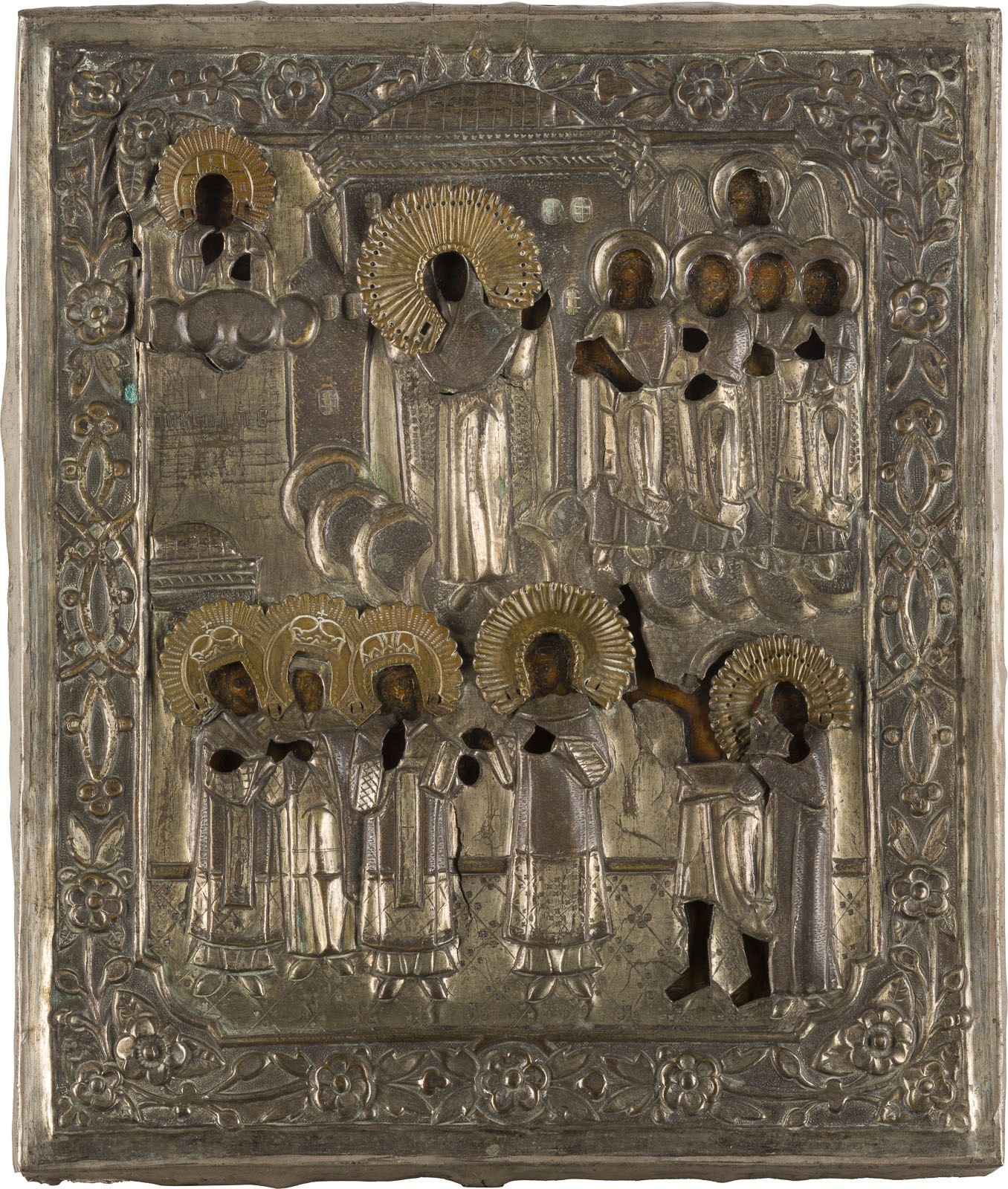 IKONE MIT DEM SCHLEIERWUNDER DER GOTTESMUTTER (POKROW) MIT OKLAD