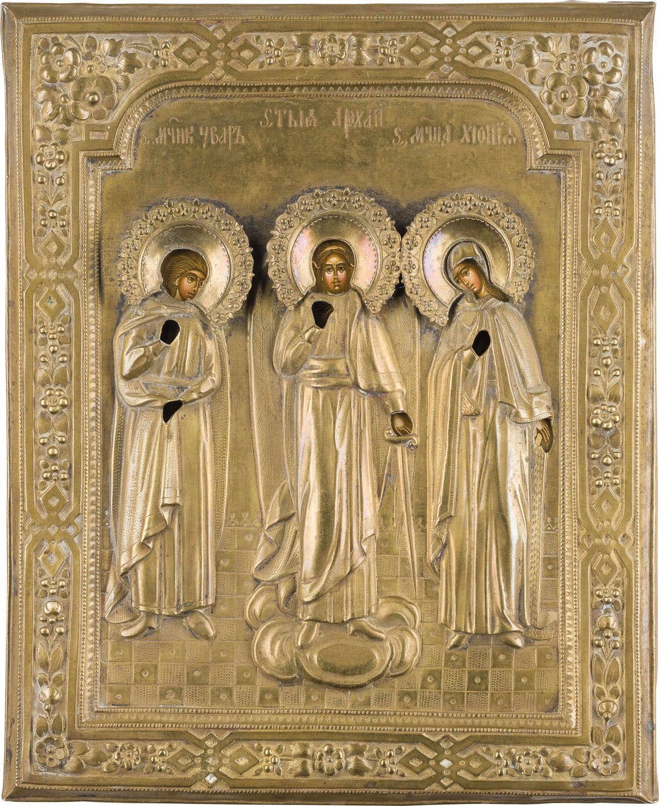 IKONE MIT DEM SCHUTZENGEL FLANKIERT VON DEN HEILIGEN VARUS UND CHIONIA MIT OKLAD