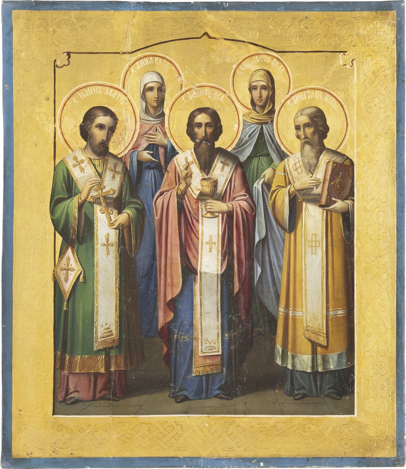 IKONE MIT DEN DREI HIERARCHEN UND DEN HEILIGEN ANNA UND ELISABETH