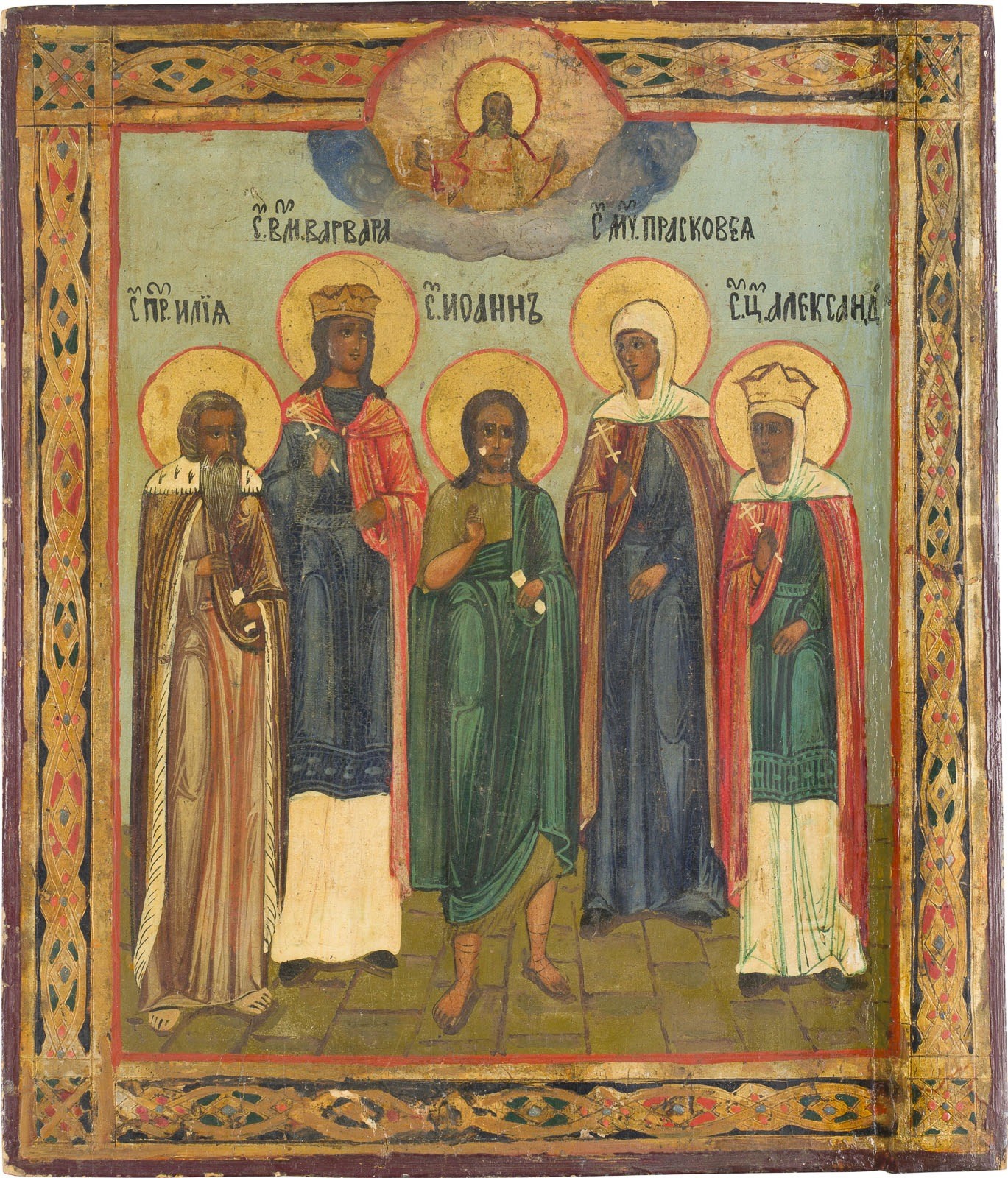 IKONE MIT DEN HEILIGEN ELIAS, BARBARA, JOHANNES DEM VORLÄUFER, PARASKEWA UND ALEXANDRA