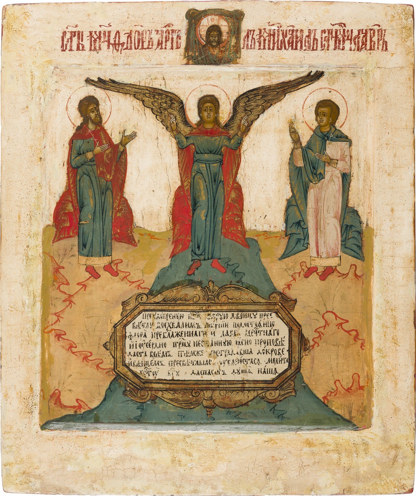 Einzeltafel mit zwei Stirnseiten-Sponki. Kowtscheg, Eitempera auf Kreidegrund, partielle Vergoldung. 31,2 x 26,5 cm. Farbe des Hintergrundes und Randes abgenommen, min. rest.