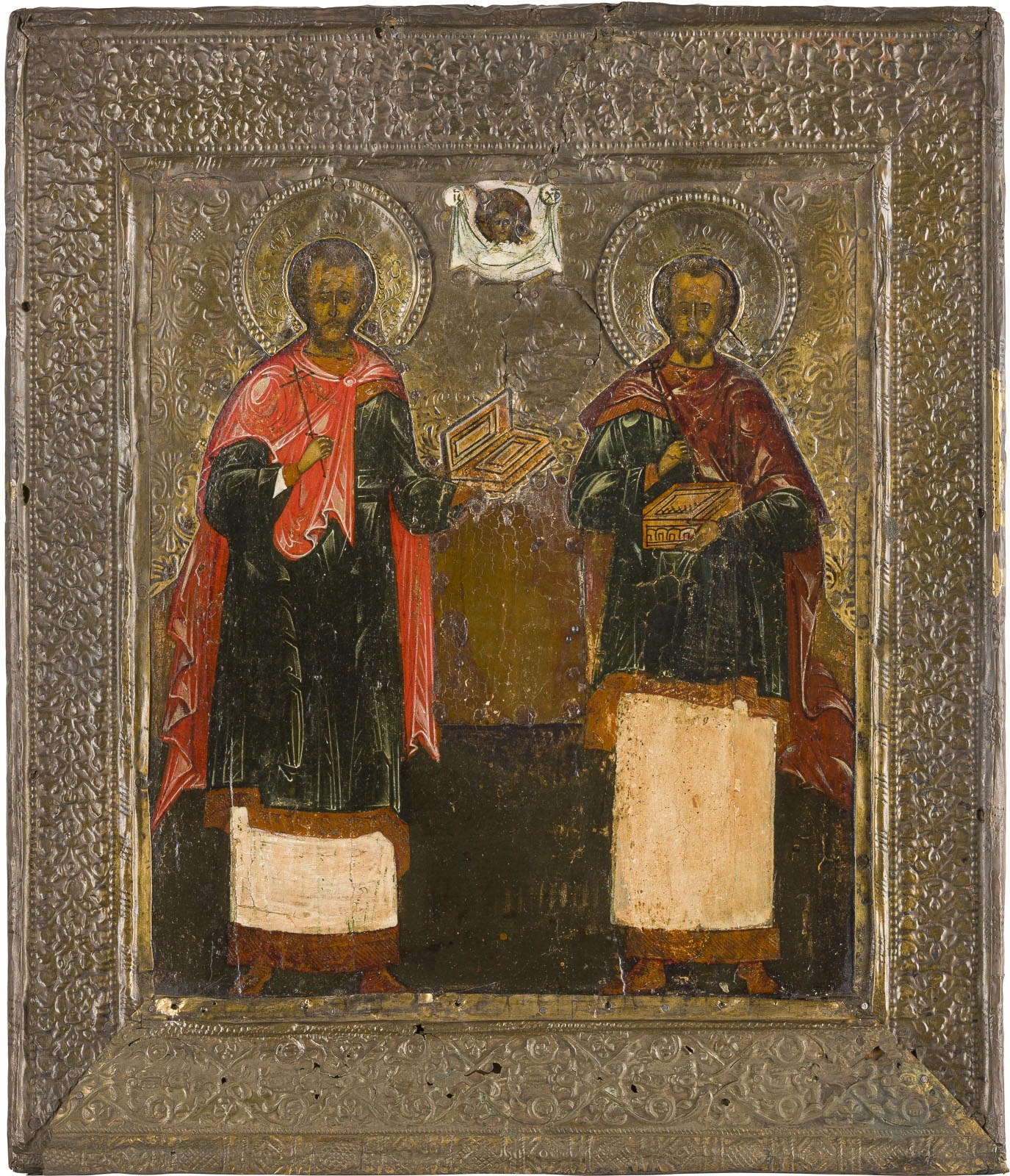 IKONE MIT DEN HEILIGEN KOSMAS UND DAMIAN MIT RIZA