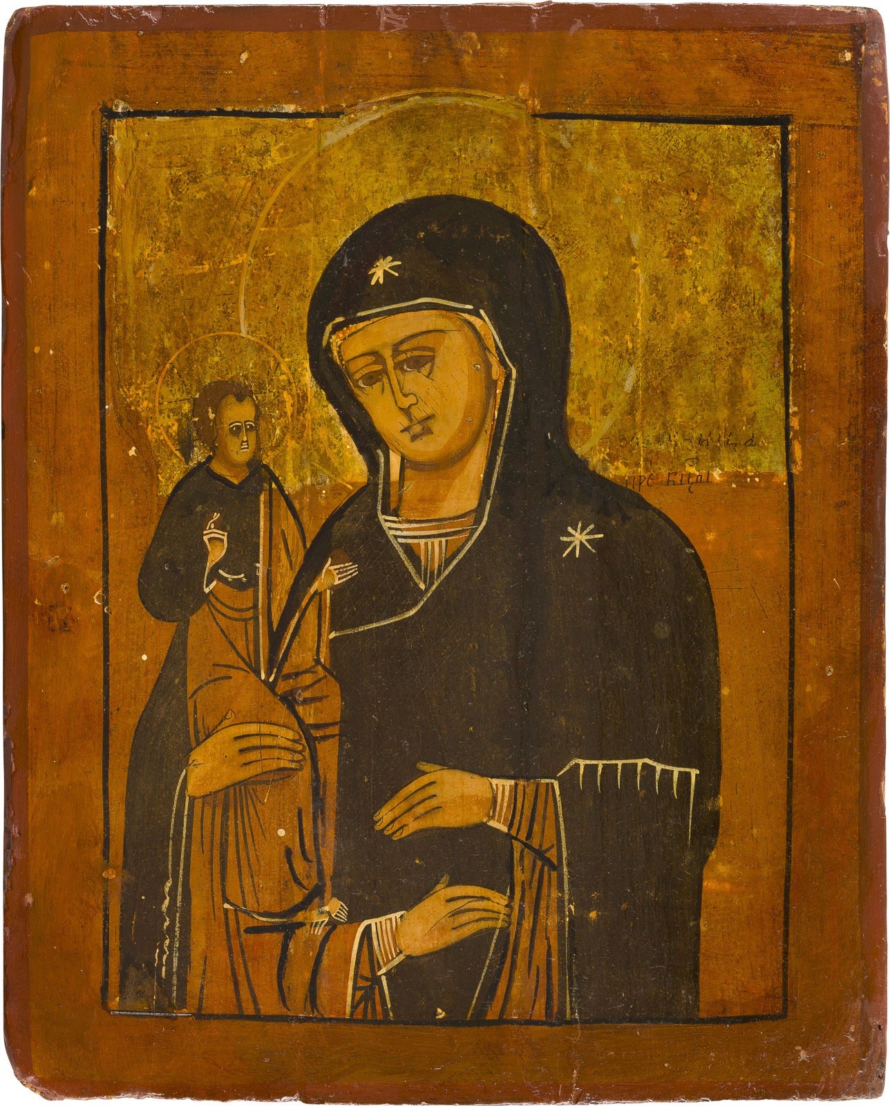 Holztafel mit zwei Rückseiten-Sponki (verloren). Eitempera auf Kreidegrund, versilberter Hintergrund goldfarben lasiert. 33,5 x 27,2 cm. Vertikale Risse und Rand rest.