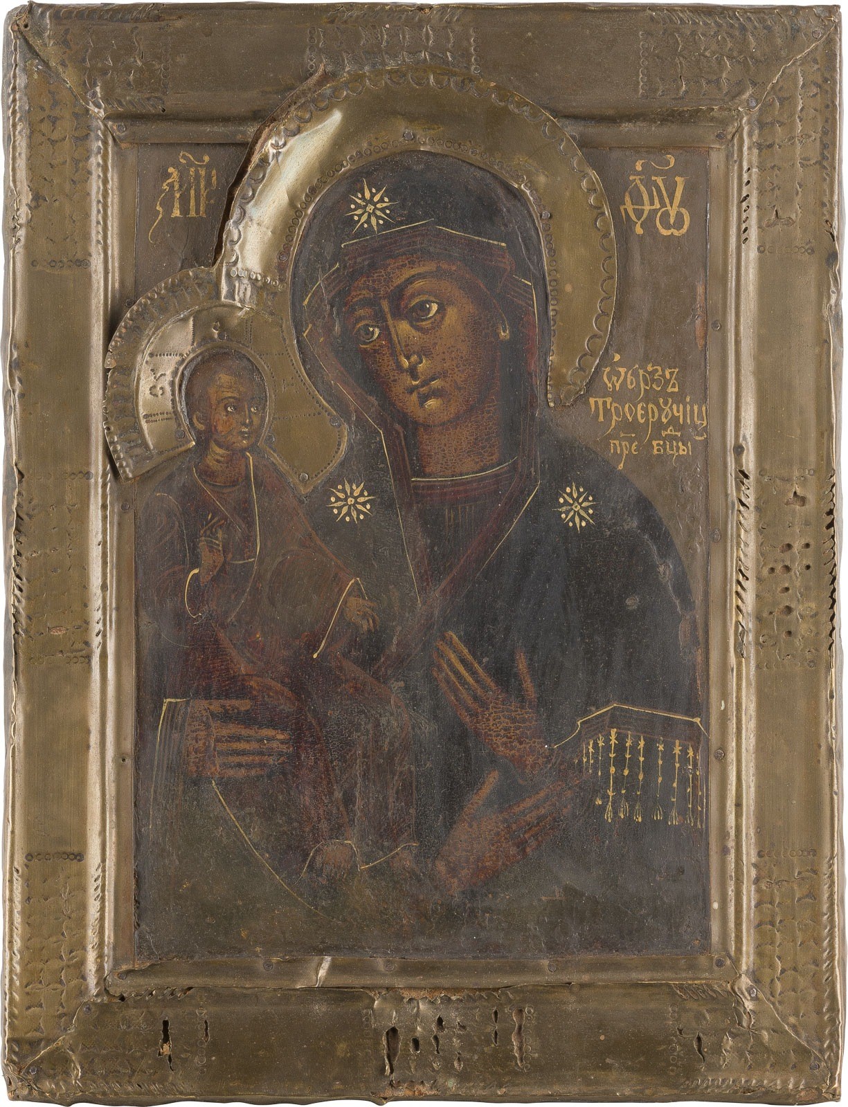 Einzeltafel mit zwei Rückseiten-Sponki. Eitempera auf Kreidegrund, Messingbasma. 30,5 x 23,5 cm. Teils besch.