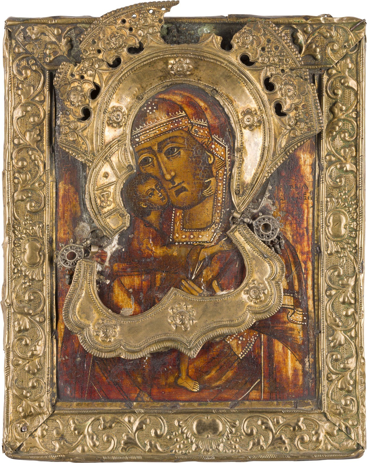 Einzeltafel mit zwei Rückseiten-Sponki (verloren). Kowtscheg, Eitempera auf Kreidegrund, goldfarben lasierte Versilberung. Messingbasma und Nimbus mit Reliefdekor. 29,7 x 24,5 cm. Nimbus besch., Substanzverluste.