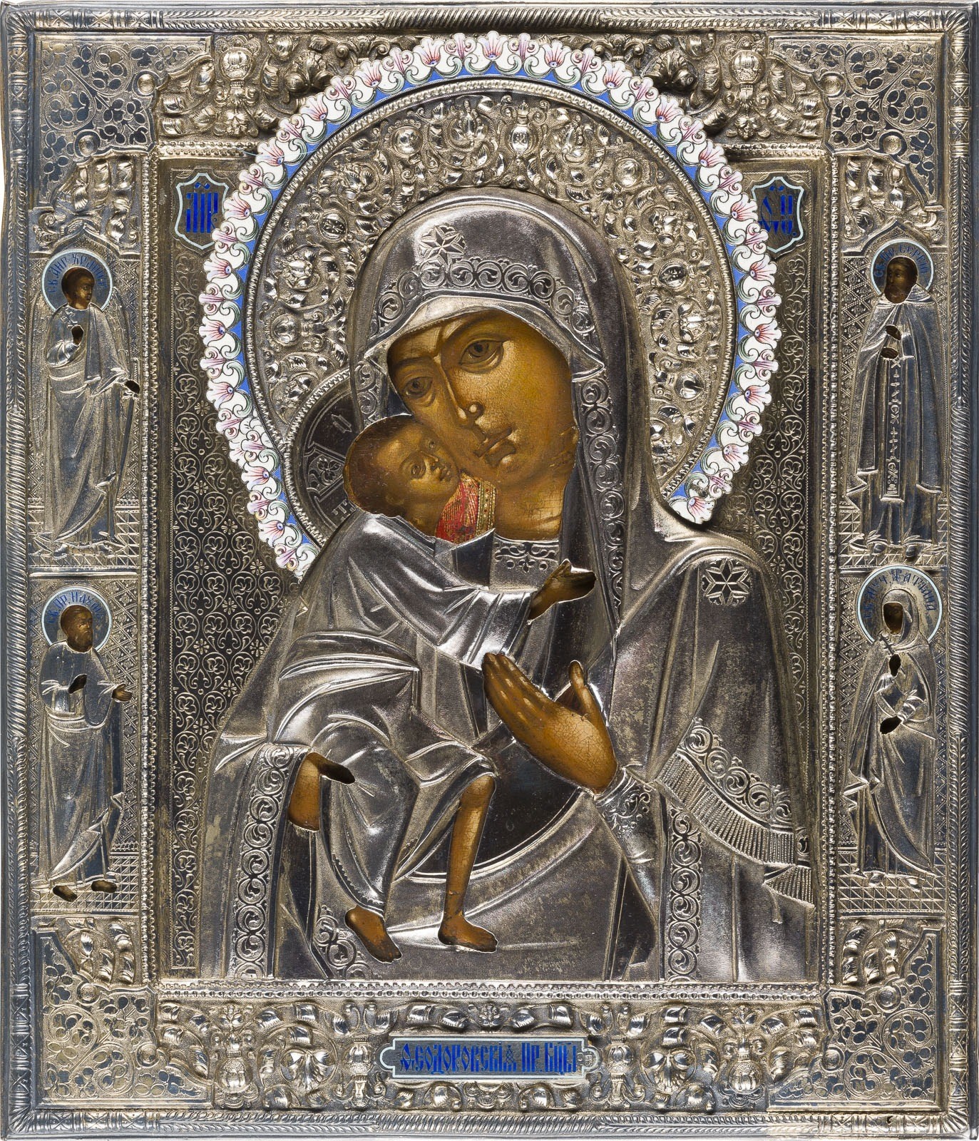 IKONE MIT DER GOTTESMUTTER FEODOROWSKAJA MIT CLOISONNÉ-EMAIL-OKLAD