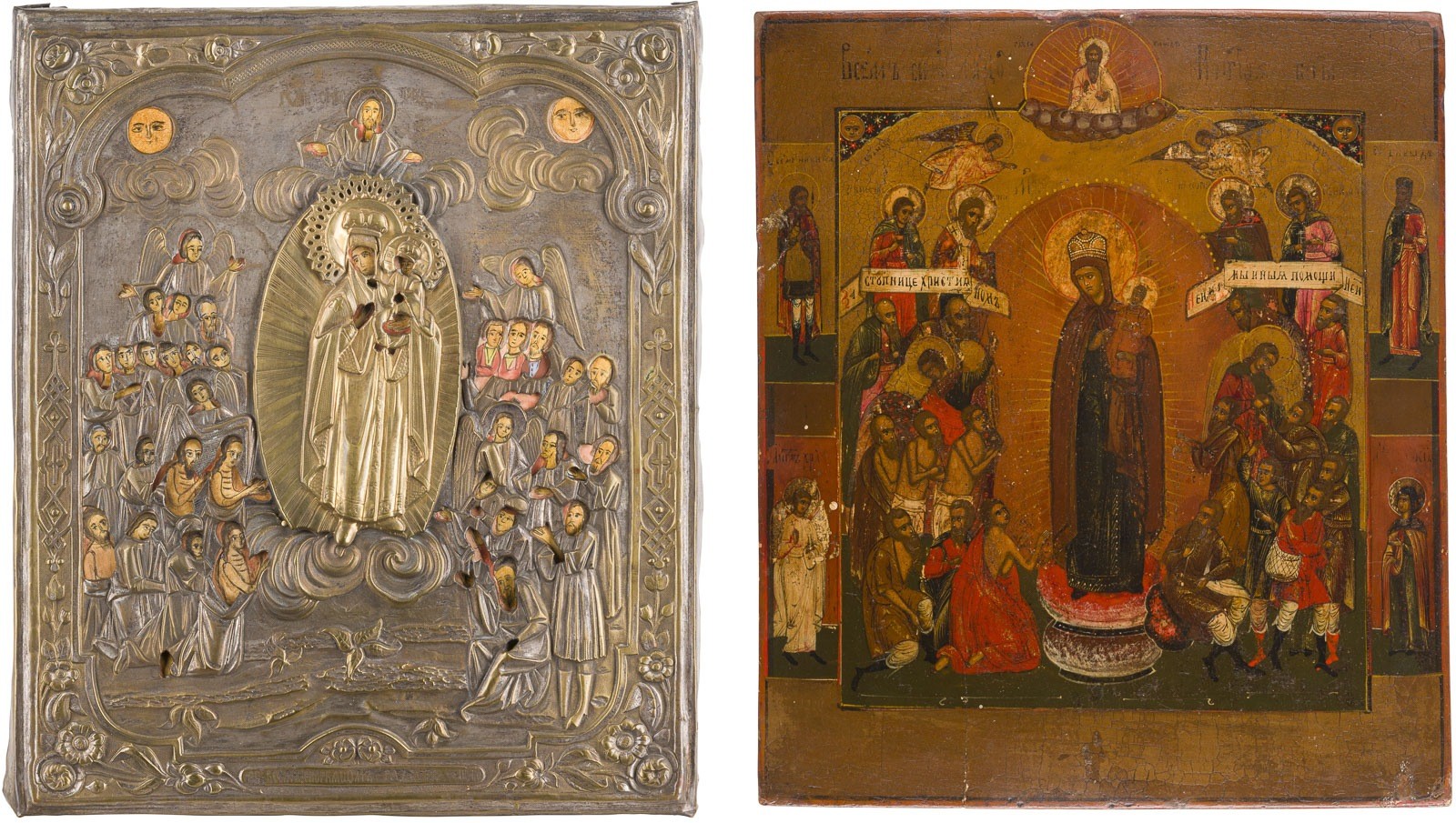 IKONE MIT DER GOTTESMUTTER 'FREUDE ALLER LEIDENDEN' UND OKLAD