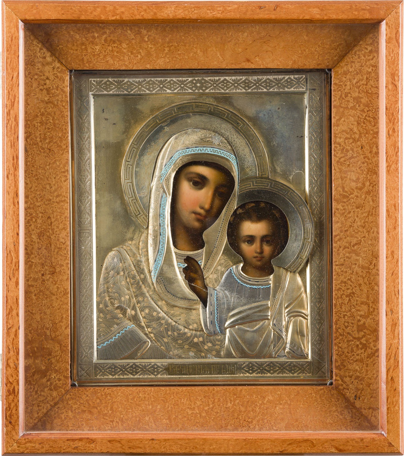 IKONE MIT DER GOTTESMUTTER VON KASAN (KASANSKAJA) MIT CHAMPLEVÉ-EMAIL-OKLAD IM KIOT