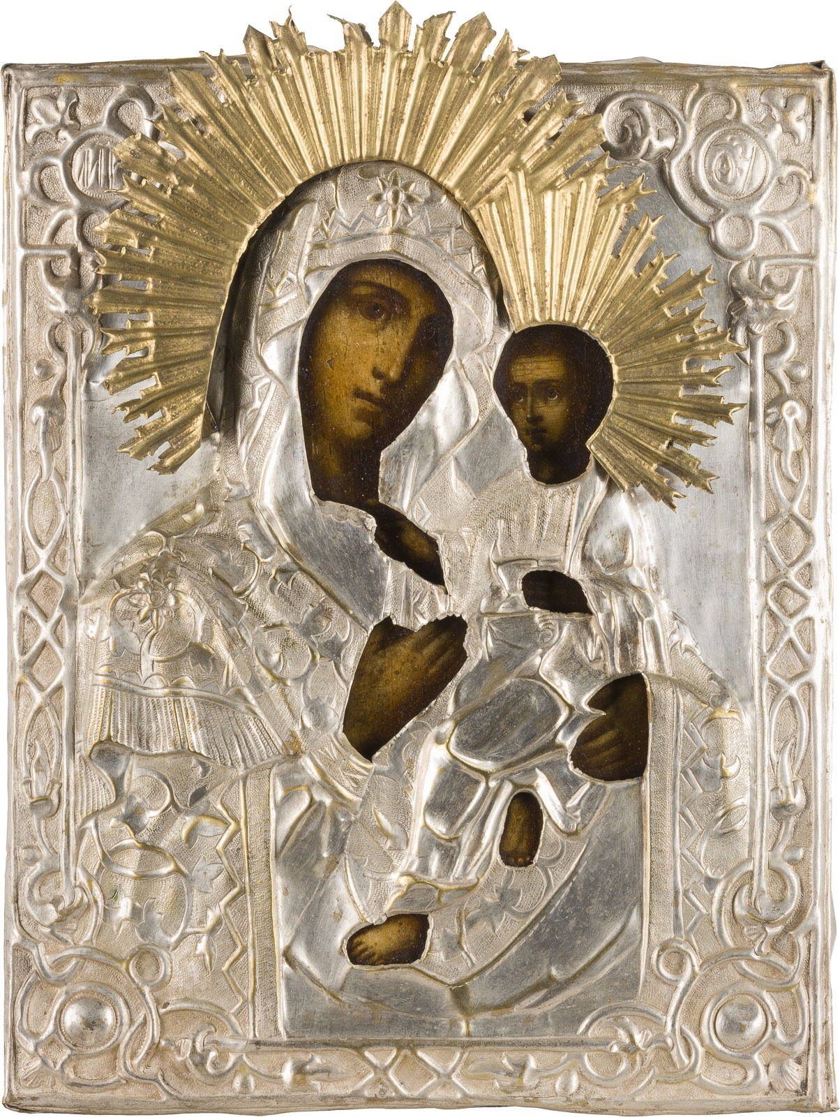 IKONE MIT DER GOTTESMUTTER VON TICHWIN (TICHWINSKAJA) MIT OKLAD