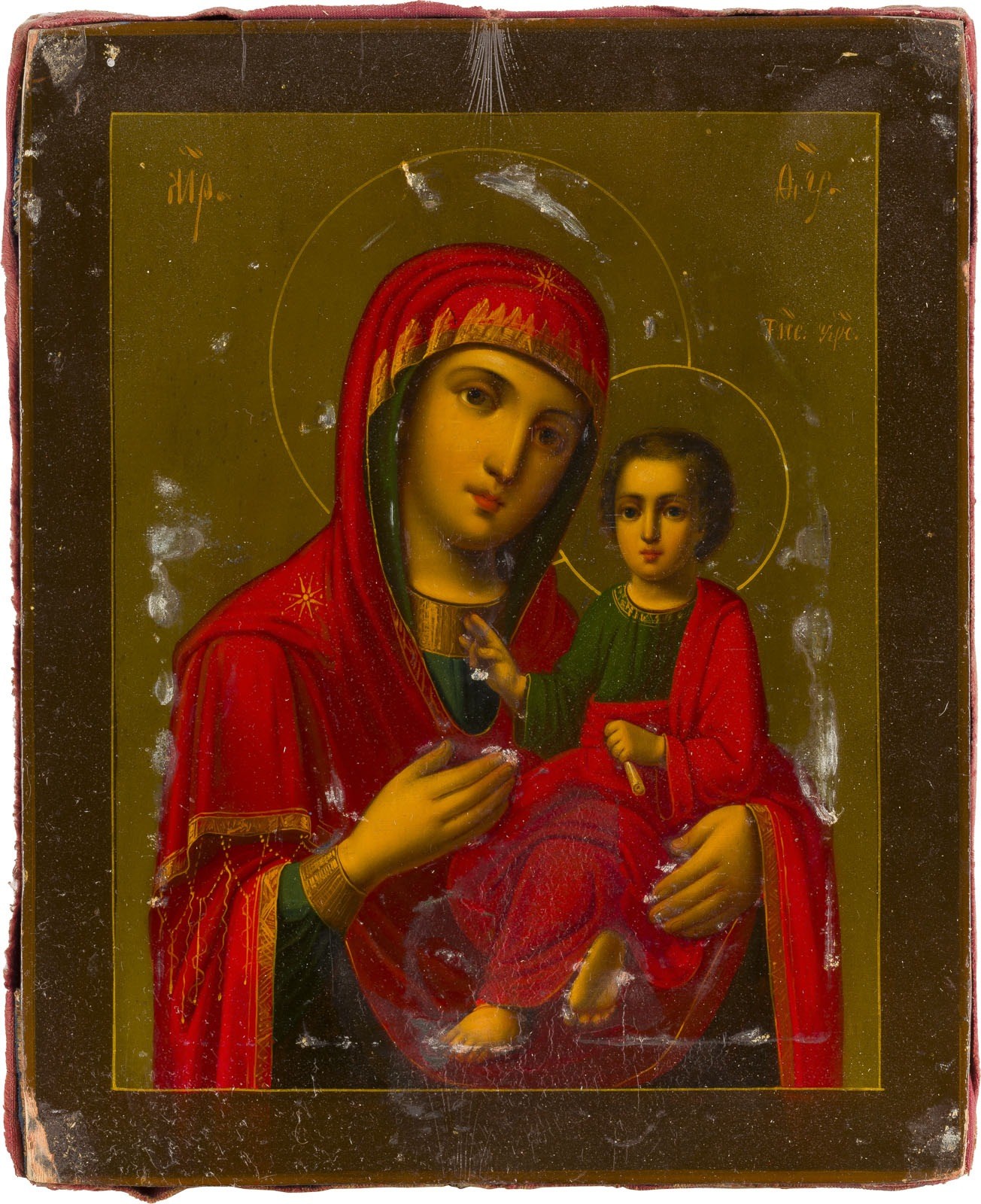 Holztafel, verso Samtabdeckung. Ölmalerei. Oklad aus vergoldetem Silber mit reliefierter Flechtwerkbordüre. 26,6 x 22,5 cm. Punziert mit Stadtmarke, Beschaumeisterzeichen, Feingehalt '84' und Meistermarke 'PI' in Kyrillisch. Min. berieben.