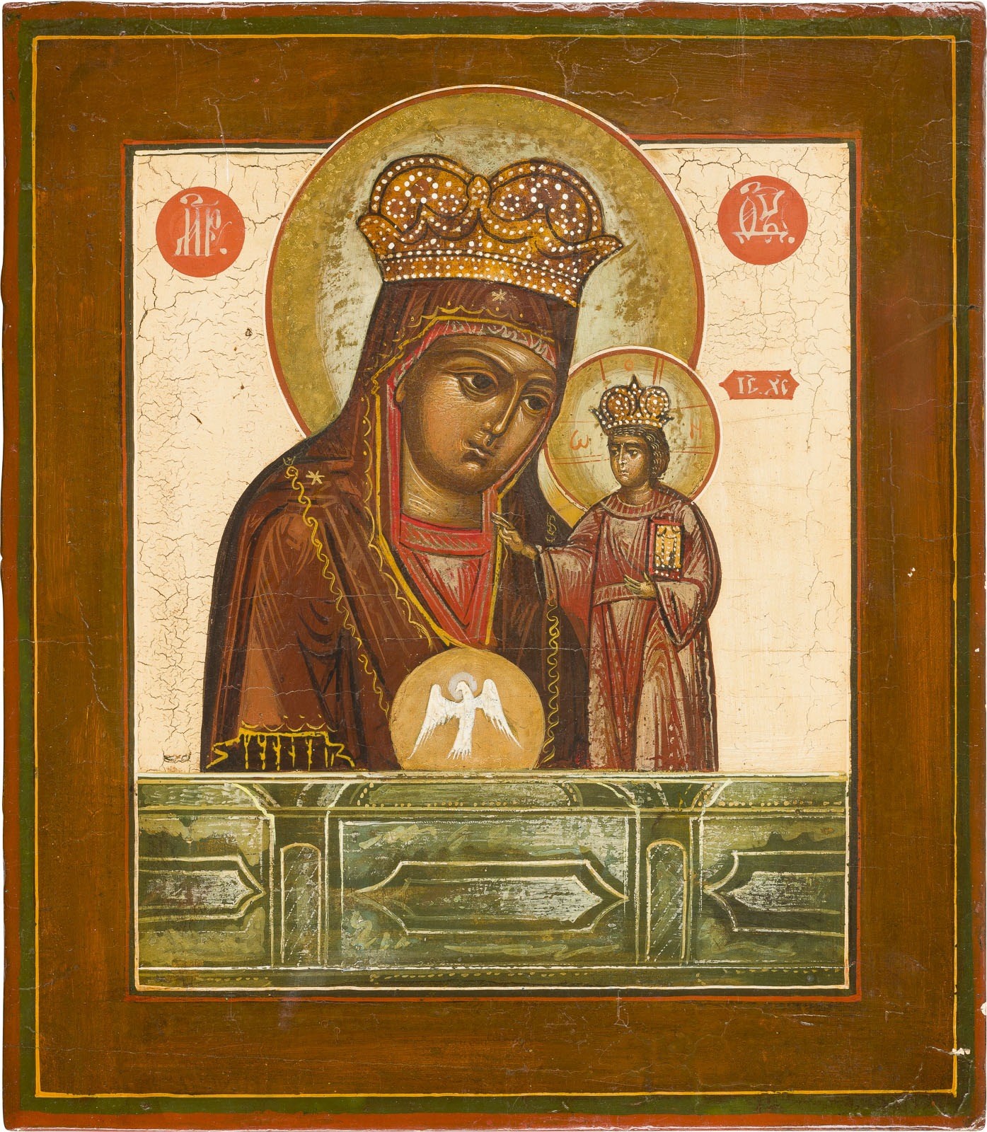 Einzeltafel mit zwei profilierten Rückseiten-Sponki. Eitempera auf Kreidegrund, versilberte Nimben goldfarben lasiert. 29,8 x 26,2 cm. Restaurierungen.