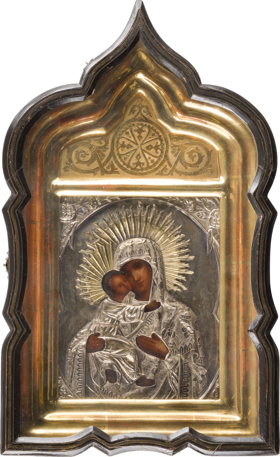 IKONE MIT DER GOTTESMUTTER VON WLADIMIR (WLADIMIRSKAJA) MIT OKLAD IM KIOT