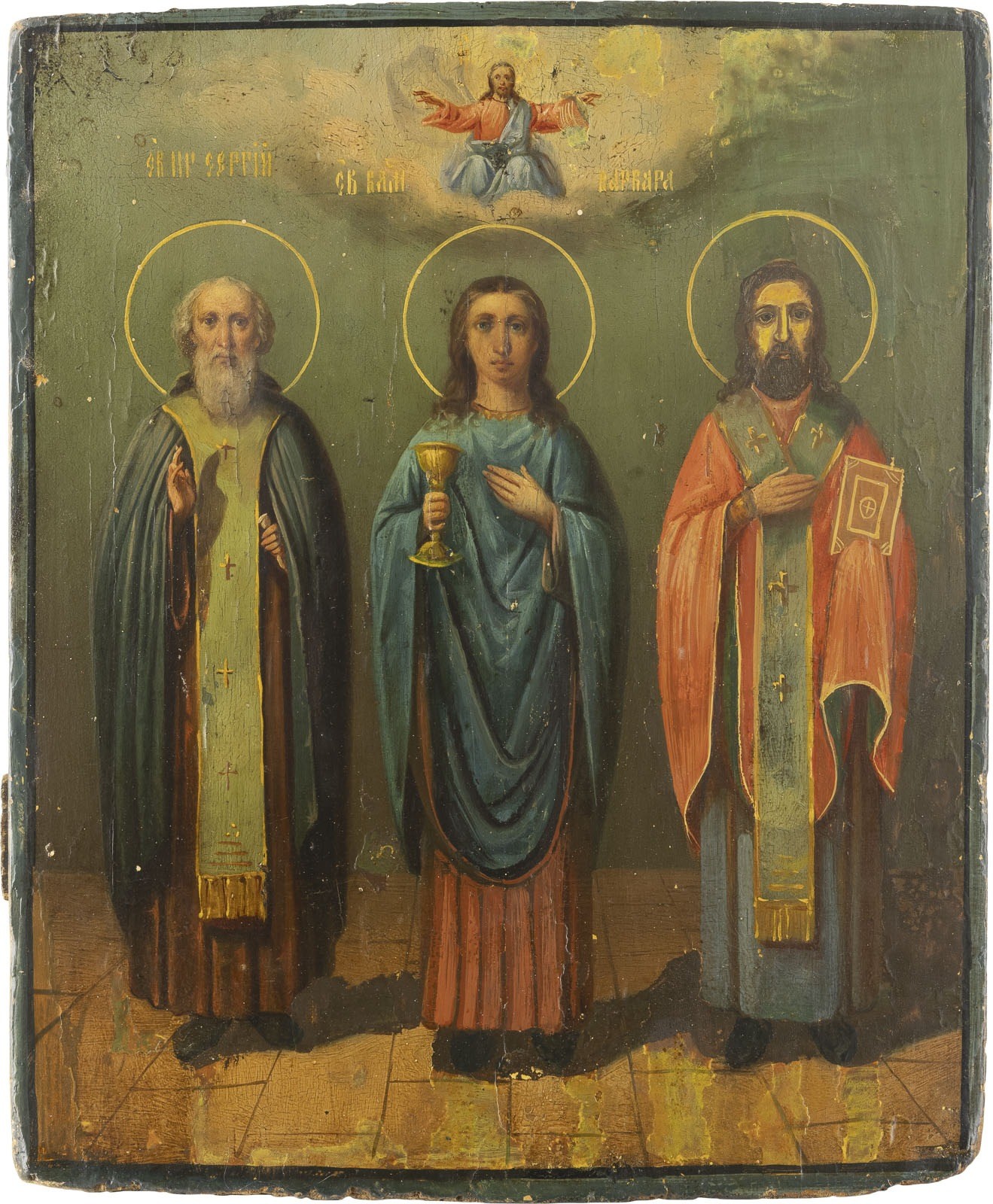 IKONE MIT DER HEILIGEN BARBARA FLANKIERT VON ZWEI HEILIGEN