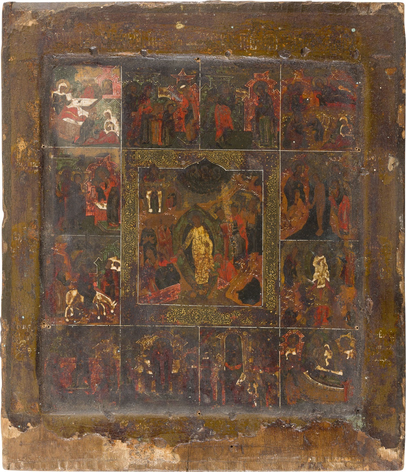 IKONE MIT DER HÖLLENFAHRT CHRISTI UND DER ALTTESTAMENTLICHEN DREIFALTIGKEIT MIT ZWÖLF HOCHFESTEN MIT VERMEIL-BASMA