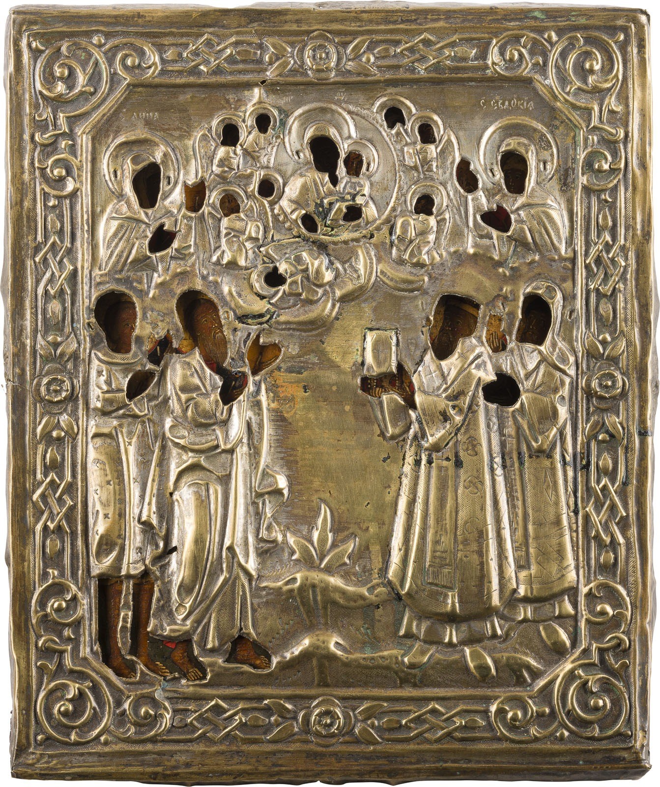 Einzeltafel mit zwei Stirnseiten-Sponki. Eitempera auf Kreidegrund, Nimben vergoldet. Messingoklad mit reliefiertem Dekor. 32,2 x 27 cm. Rest.