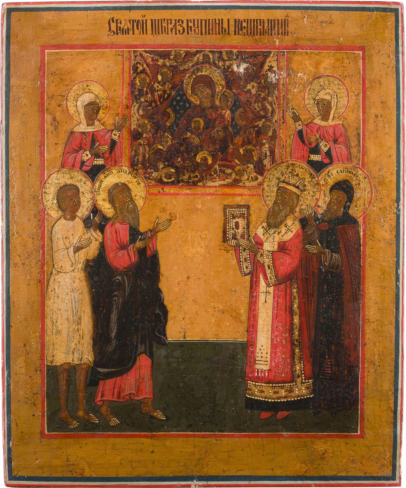 IKONE MIT DER VEREHRUNG DER GOTTESMUTTER 'UNVERBRENNBARER DORNBUSCH' VON SECHS HEILIGEN MIT OKLAD