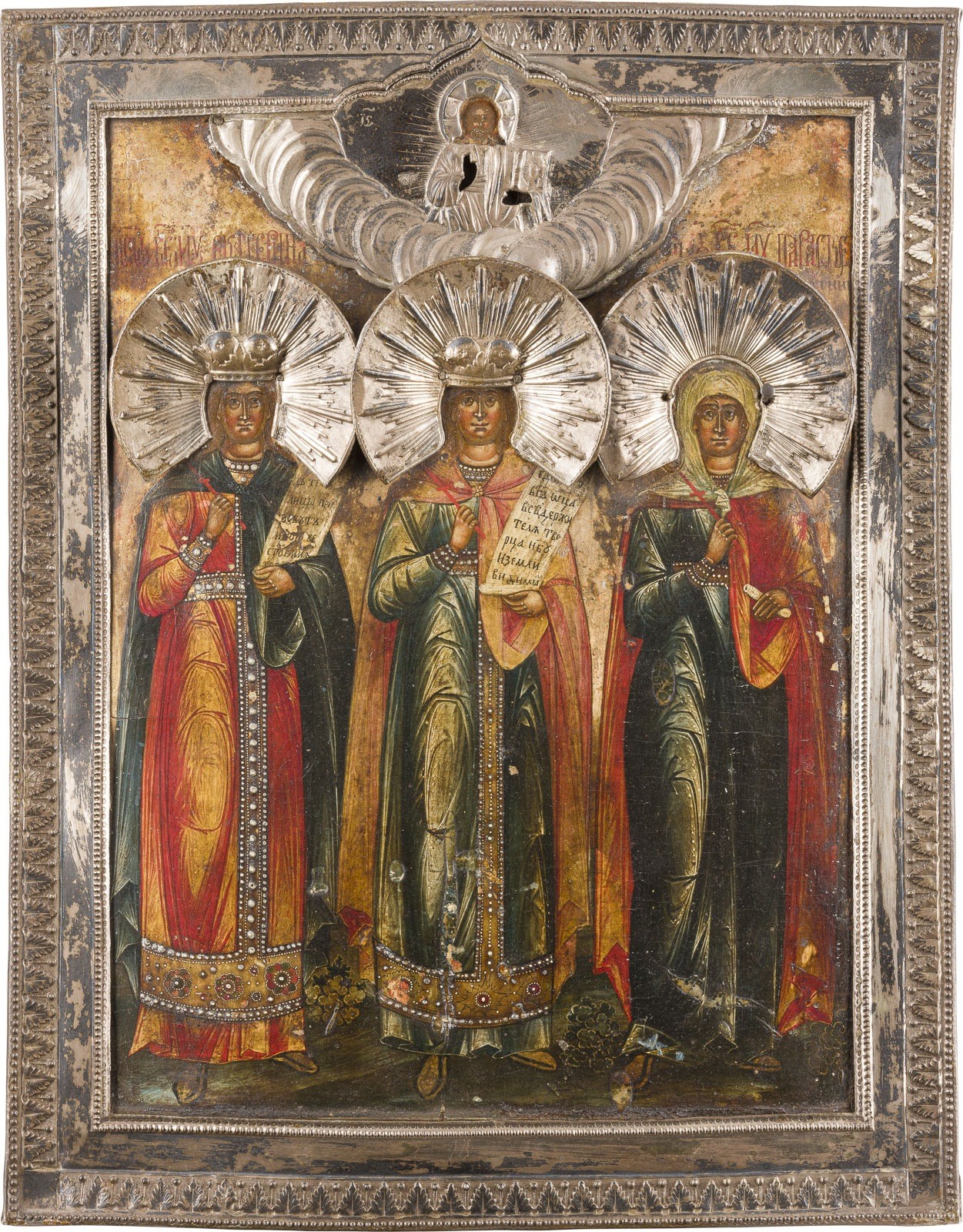 IKONE MIT DREI MÄRTYRERINNEN MIT SILBER-BASMA