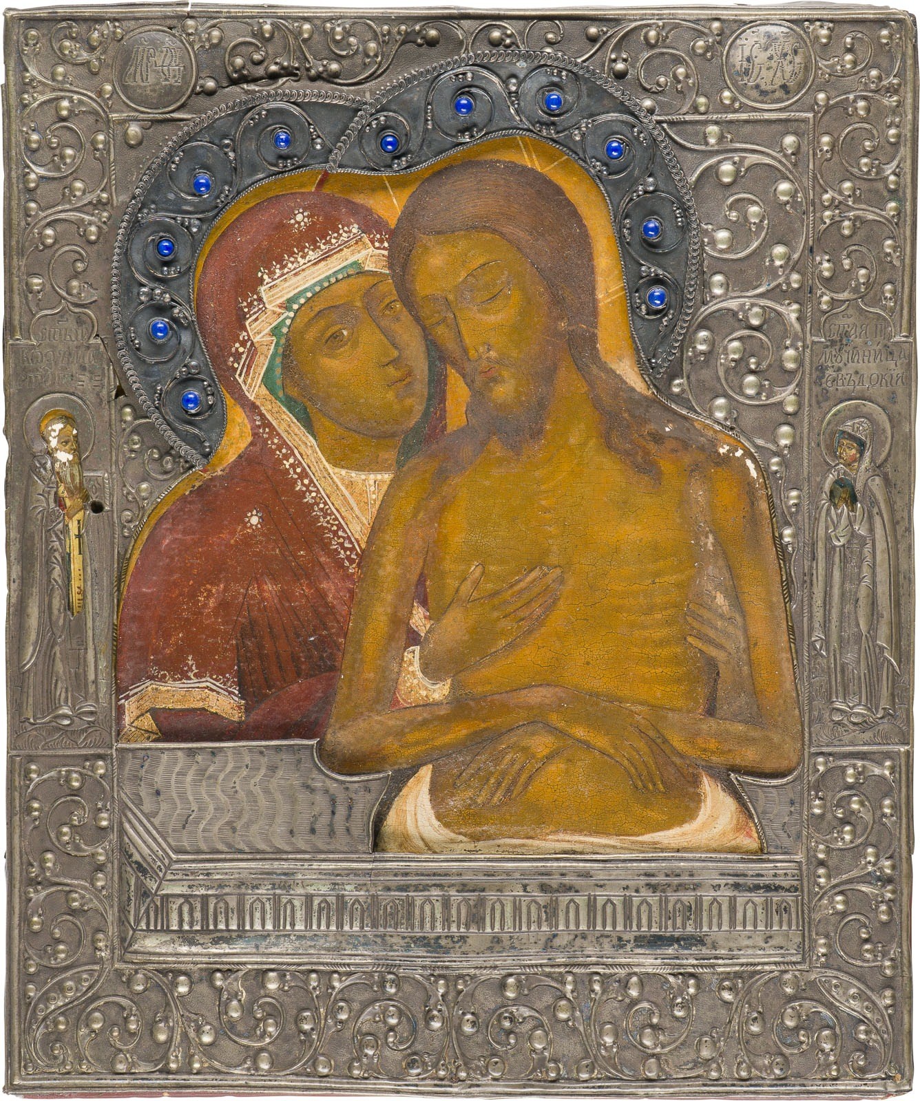 Einzeltafel mit zwei Stirnseiten-Sponki. Eitempera auf Kreidegrund. Riza aus Metall, Cabochon-Besatz. 31,3 x 26 cm. Zwei Randheilige. Restaurierungen, Rizarand besch.