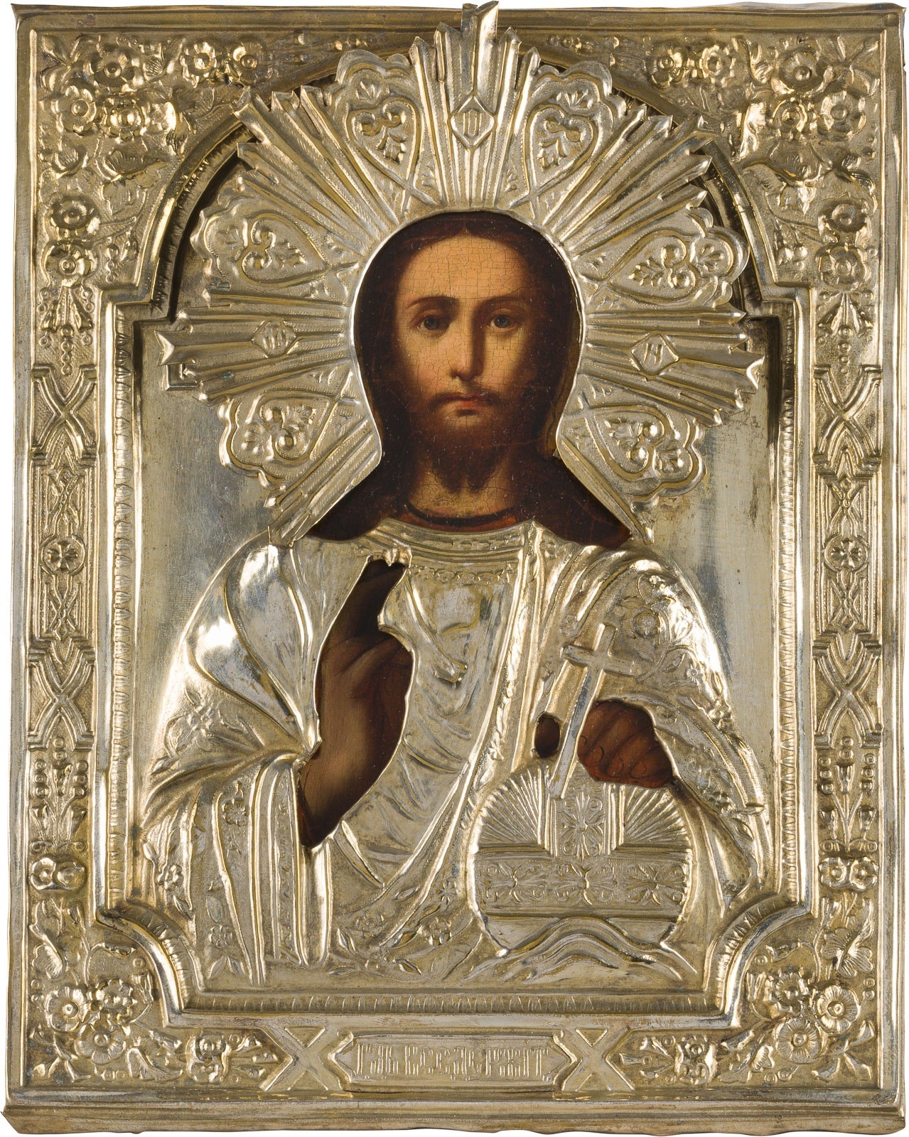KLEINE IKONE MIT CHRISTUS DEM WELTENHERRSCHER MIT OKLAD