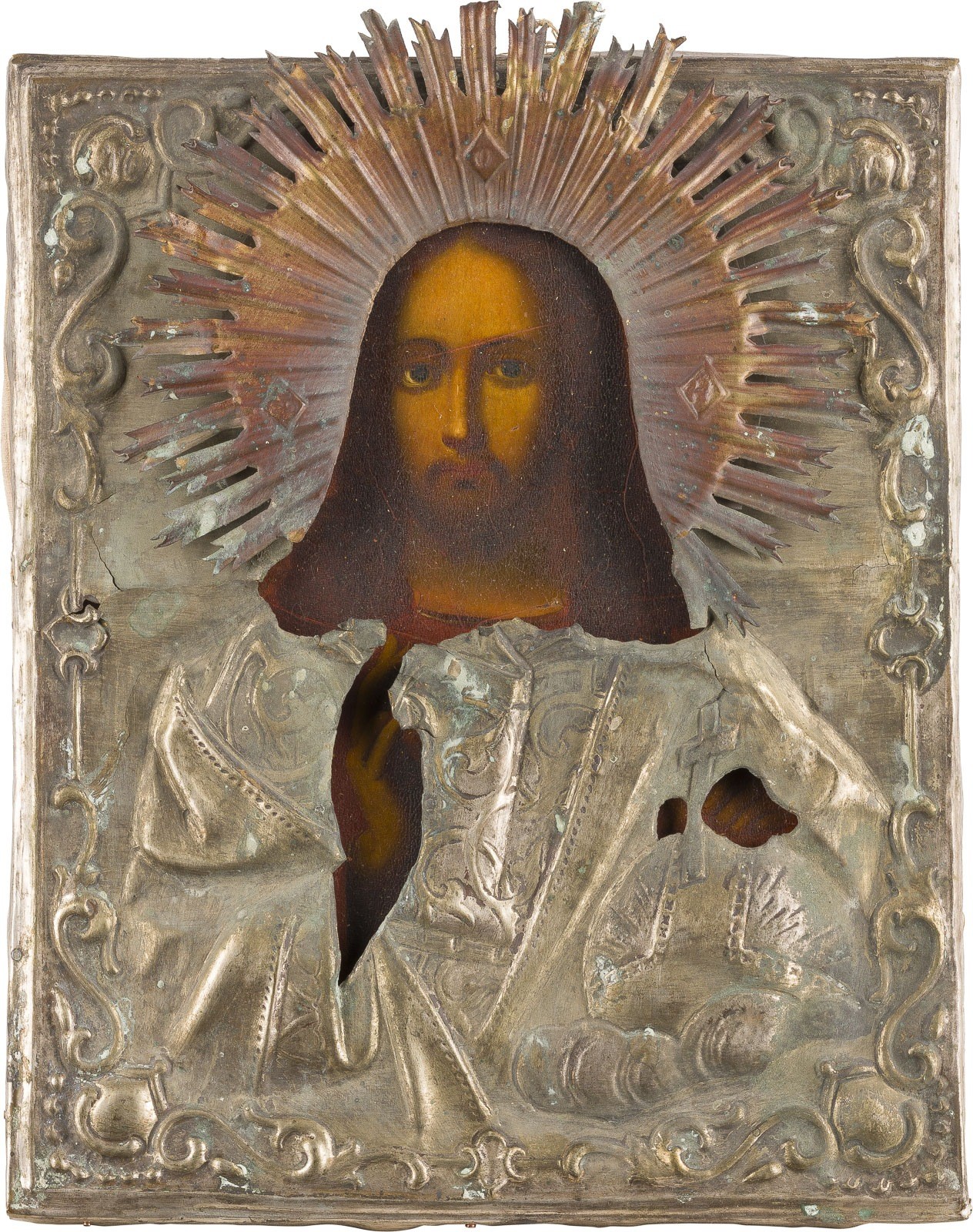 KLEINE IKONE MIT CHRISTUS DEM WELTENHERRSCHER MIT OKLAD