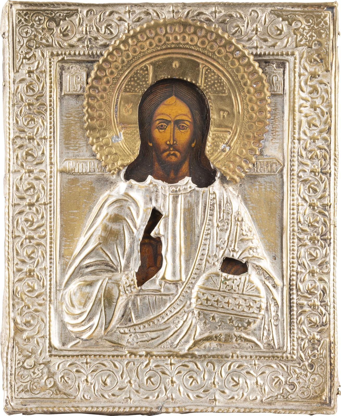 KLEINE IKONE MIT CHRISTUS DEM WELTENHERRSCHER MIT OKLAD