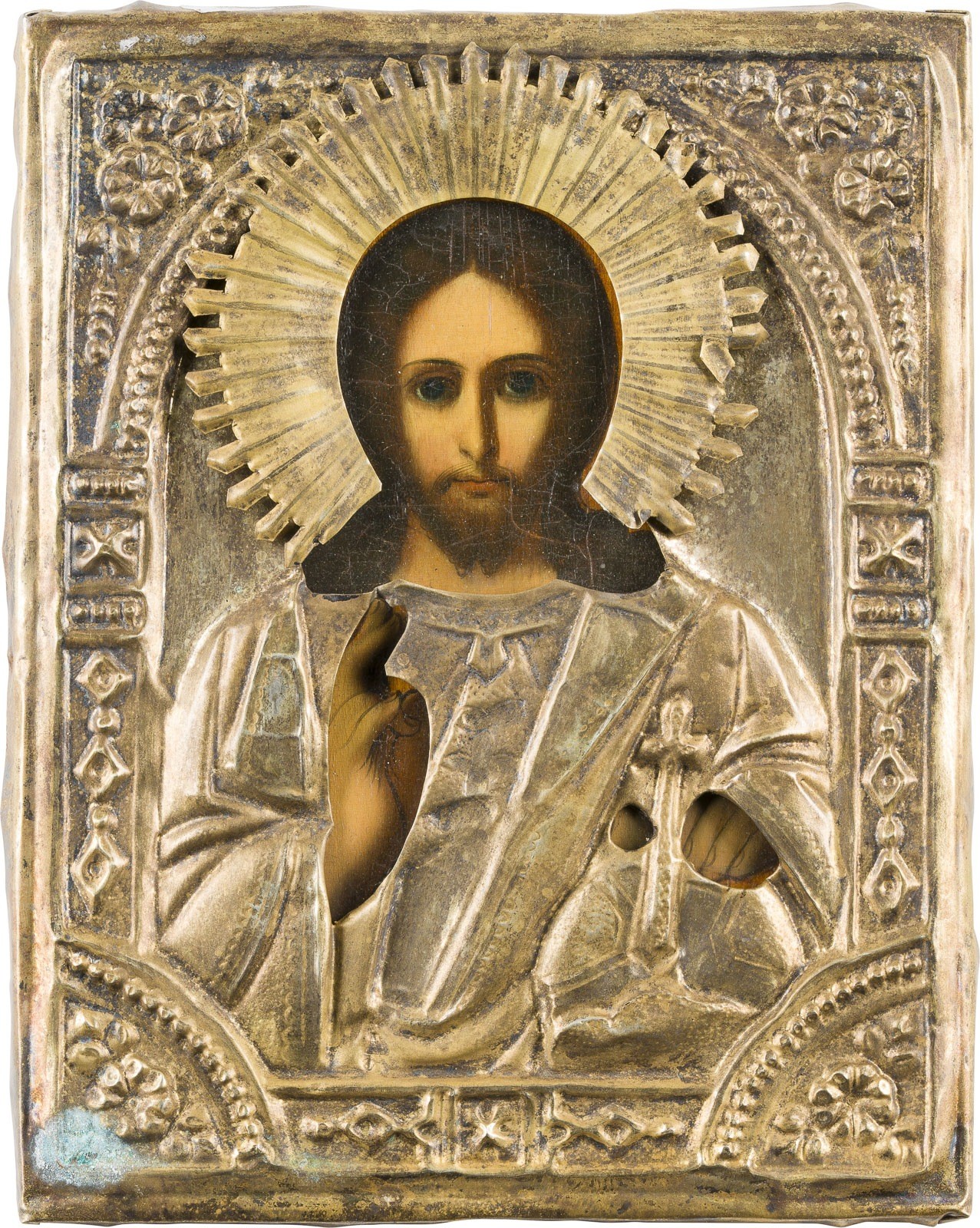 KLEINE IKONE MIT CHRISTUS DEM WELTENHERRSCHER MIT OKLAD