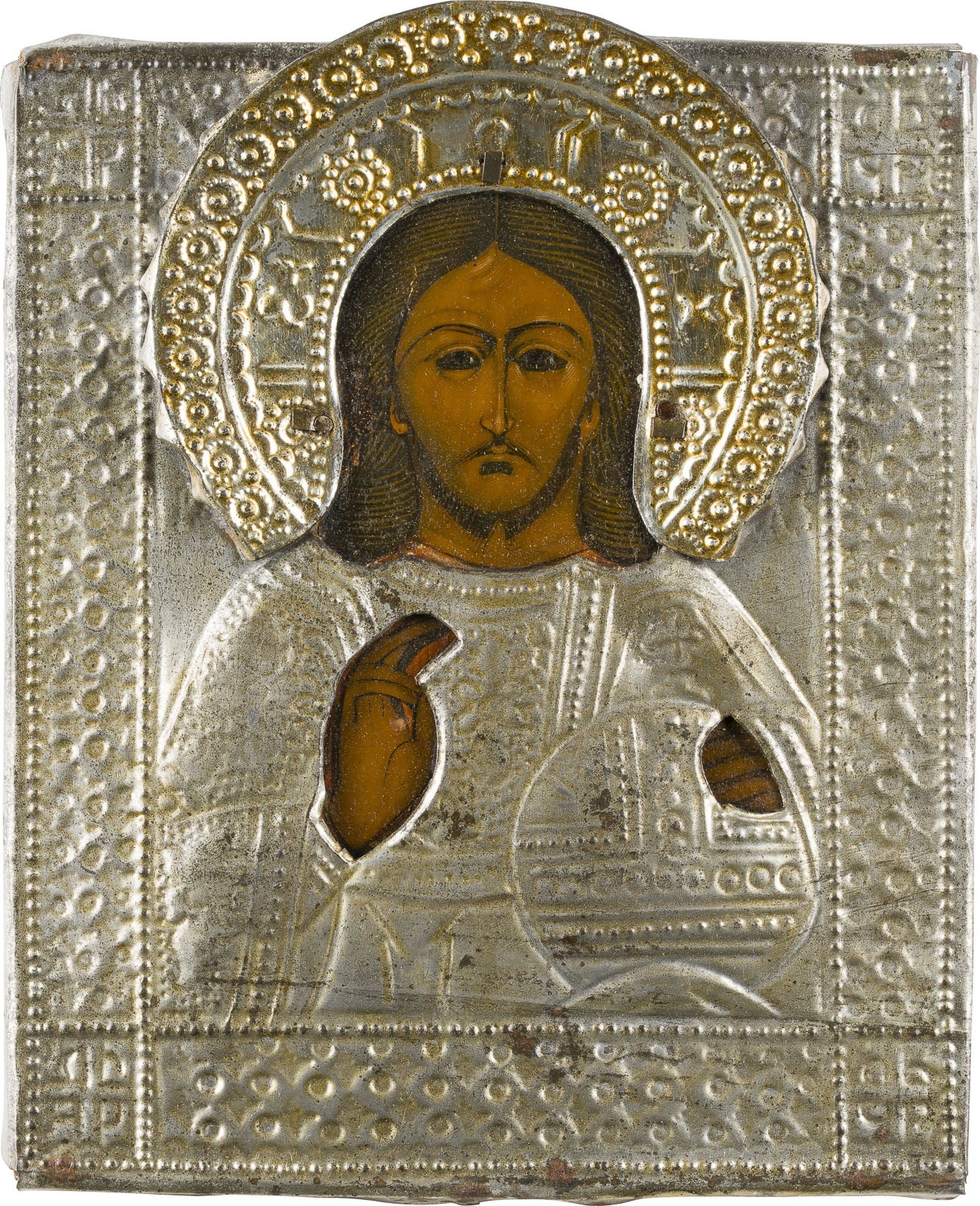 KLEINE IKONE MIT CHRISTUS DEM WELTENHERRSCHER MIT OKLAD
