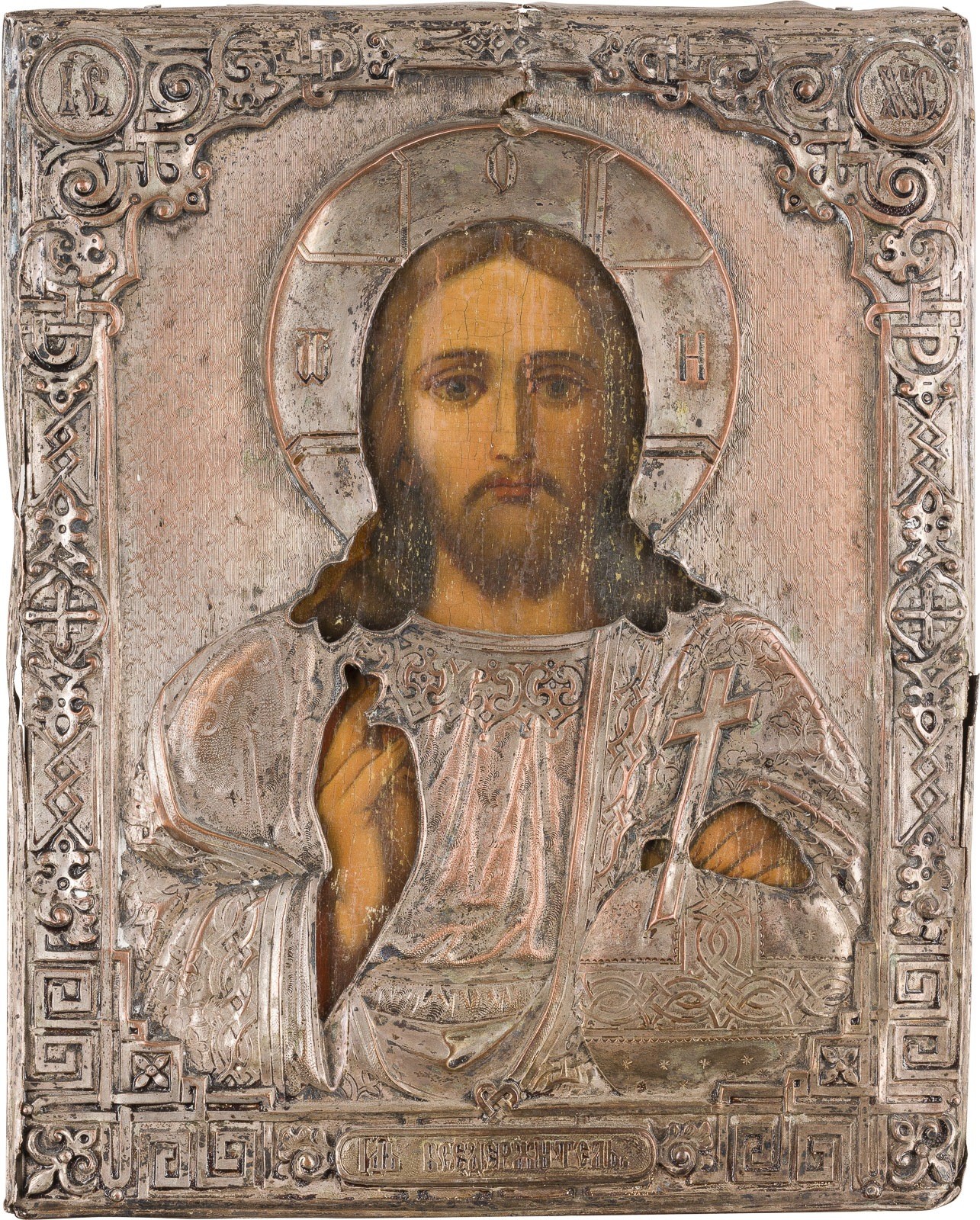 KLEINE IKONE MIT CHRISTUS DEM WELTENHERRSCHER MIT OKLAD