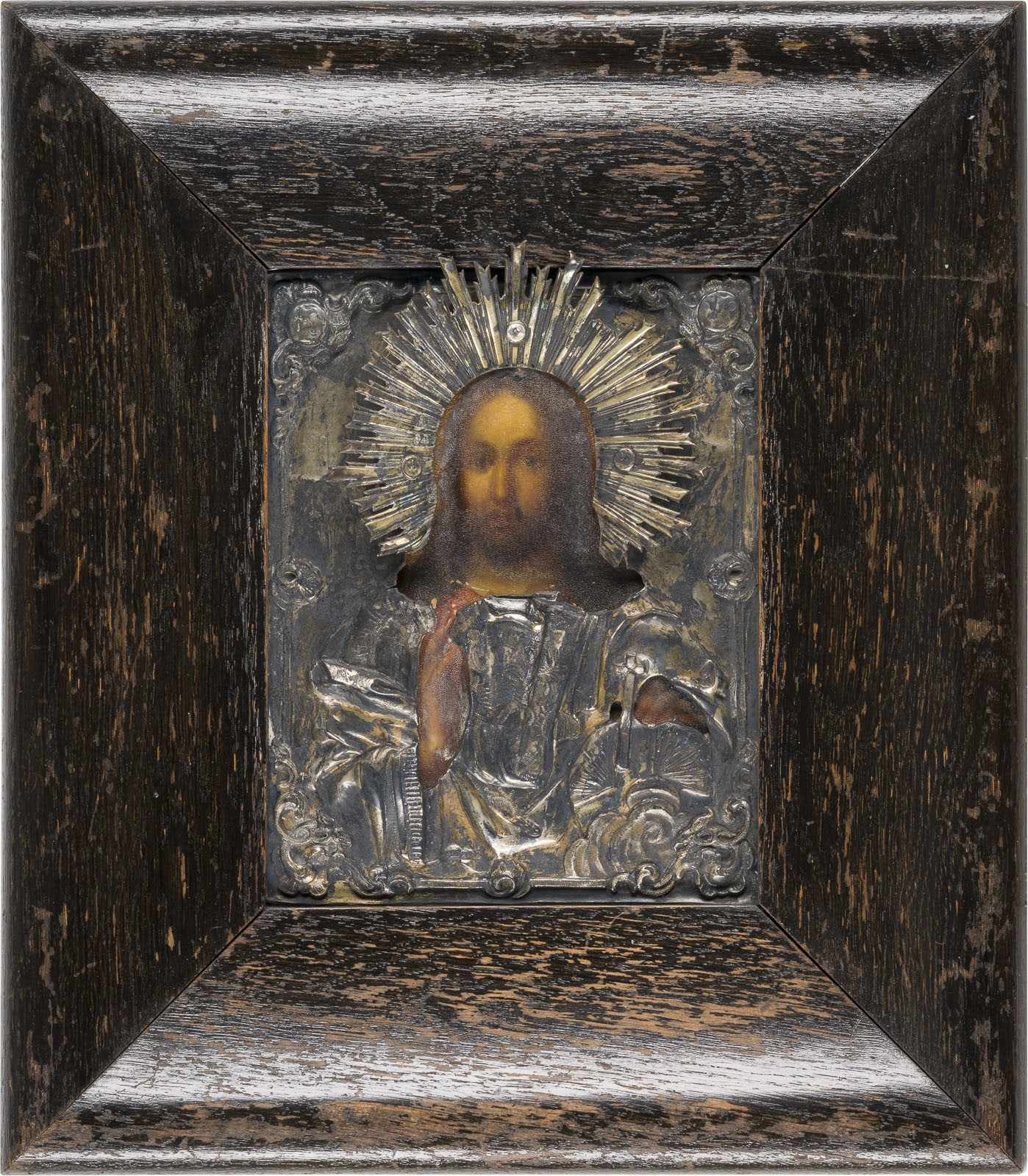 KLEINE IKONE MIT CHRISTUS DEM WELTENHERRSCHER MIT VERMEIL-OKLAD